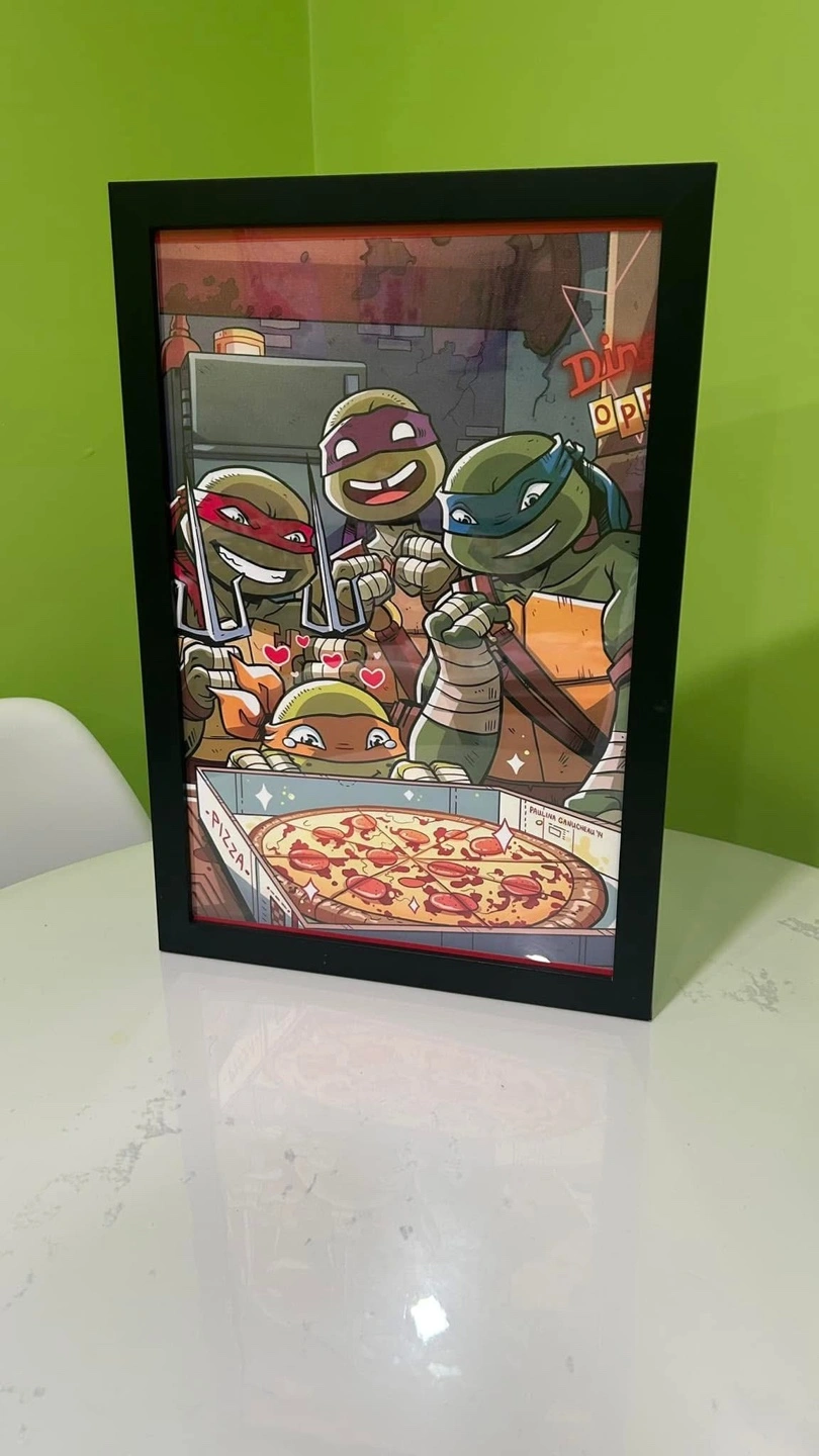 Framed print featuring the Teenage Mutant Ninja Turtles enjoying pizza! Perfect for a kids' room or a TMNT fan. 12 x 18 inches