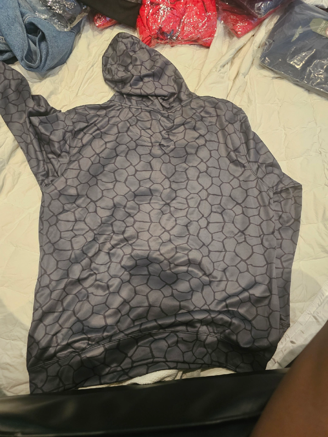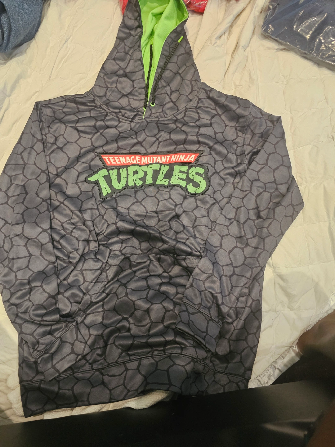 55Selling a Teenage Mutant Ninja Turtles hoodie with a cool grey and black pattern. It has a green lining in the hood. Great for any TMNT fan!