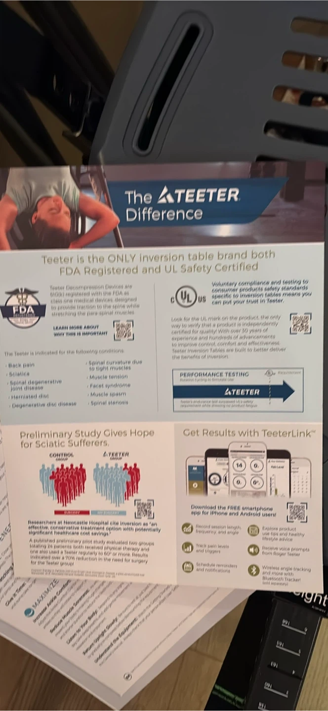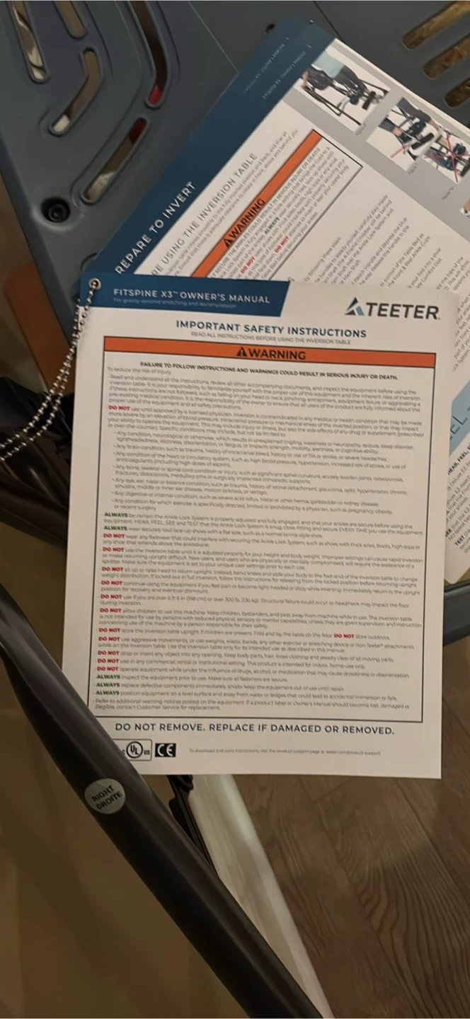 10Selling a Teeter FitSpine X3 Inversion Table. It is FDA Registered and UL Safety Certified. It comes with the owner's manual.