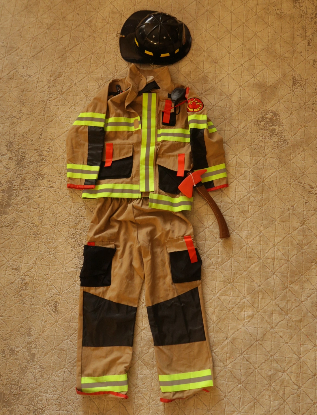 10Wore last year only. Features: Firefighter Jacket With Reflective Stripes and Lettering, Attached Toy Radio and Working Whistle Firefighter Trousers with Reflective Stripes & Knee Pads Additional Plastic Accessories Including Size Adjustable Size Firefighter Helmet and Firefighter Axe Available In Child Sizes 7/8