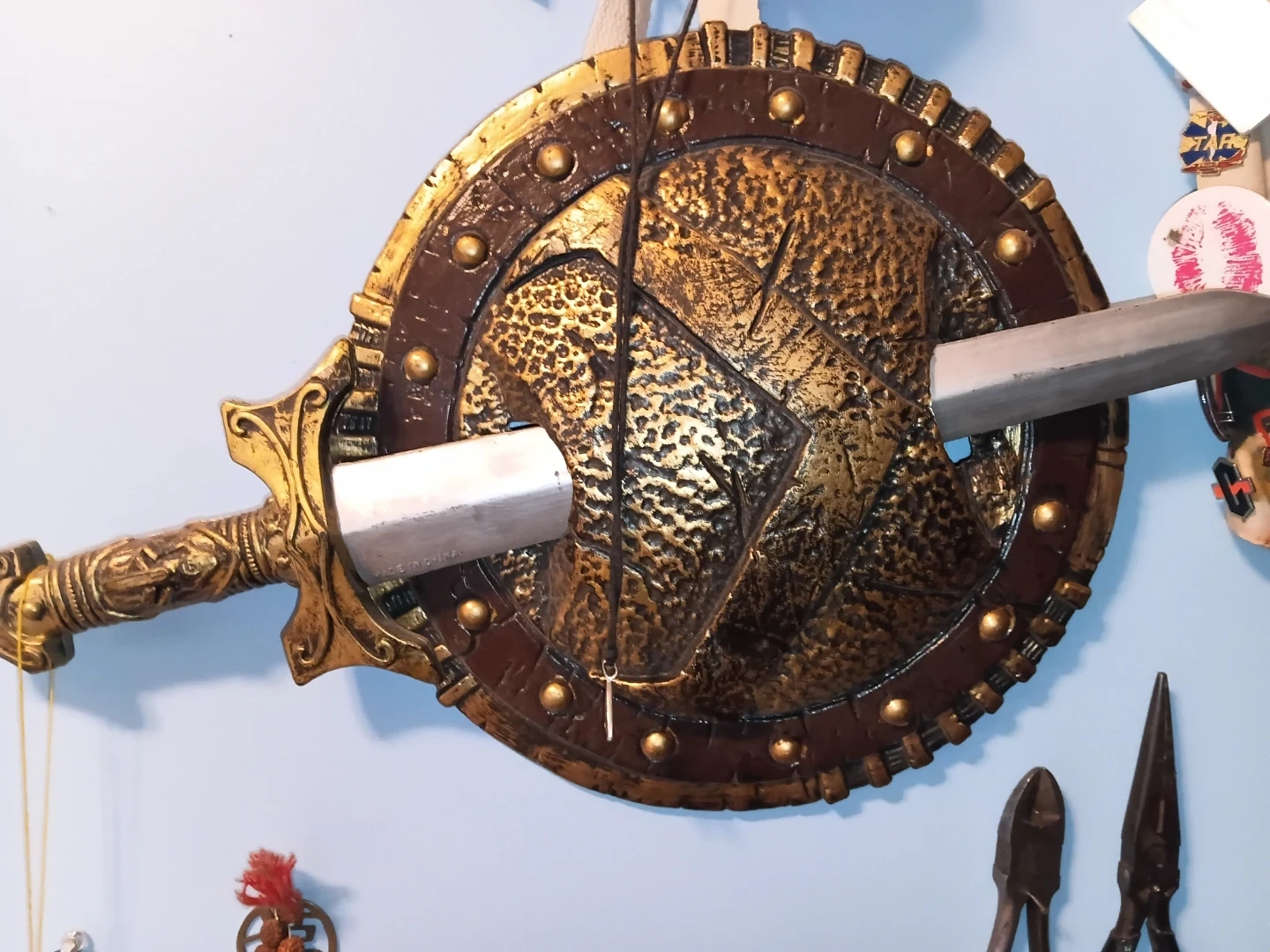 This is a replica Spartan helmet and shield set. It's made of plastic with a metallic gold and brown finish. The shield has a textured pattern and is adorned with faux rivets. It's a cool decorative piece!