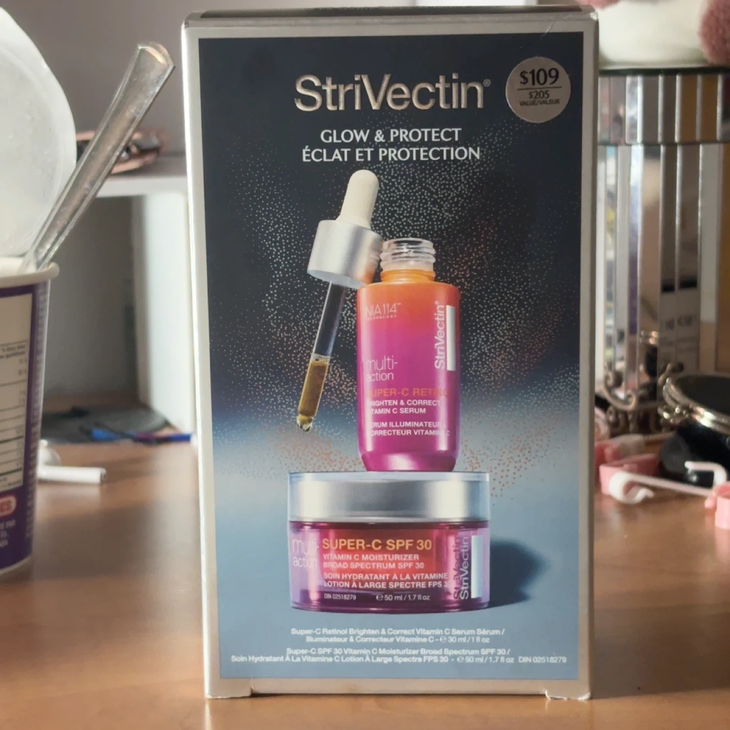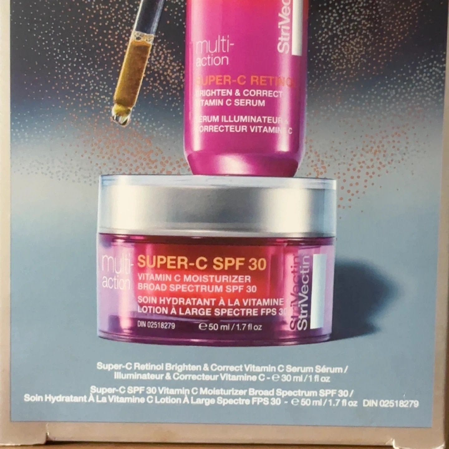 This Strivectin set includes the Super-C Retinol Brighten & Correct Vitamin C Serum and the Super-C SPF 30 Vitamin C Moisturizer. Each product is 30 ml / 1 fl oz. It's designed to illuminate and protect your skin. Perfect for a last minute gift!