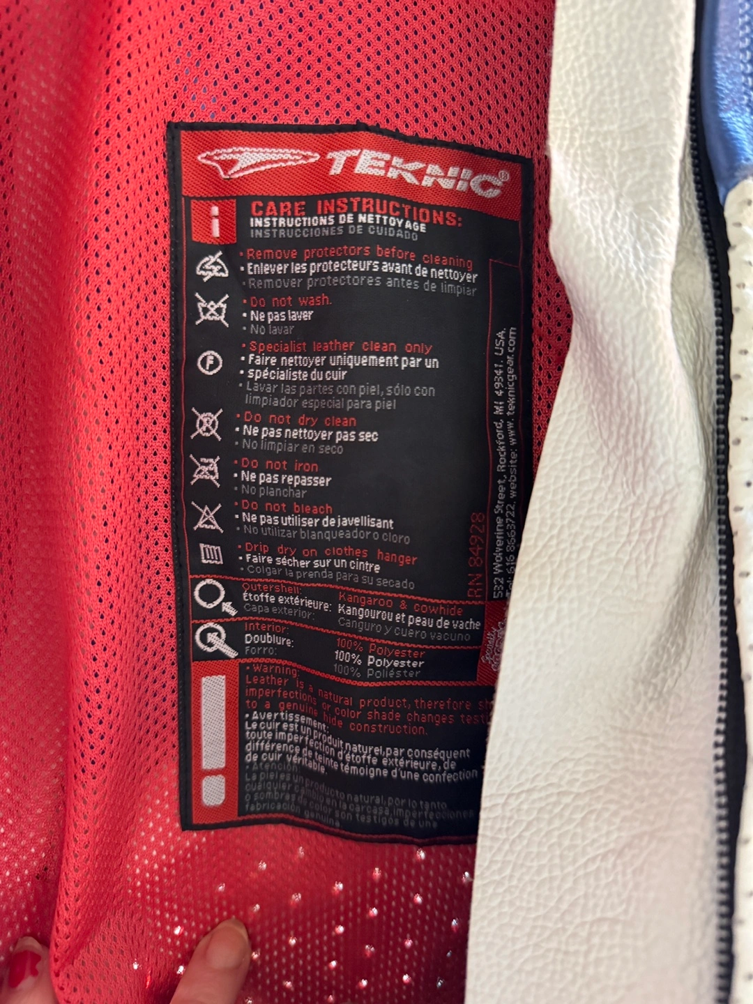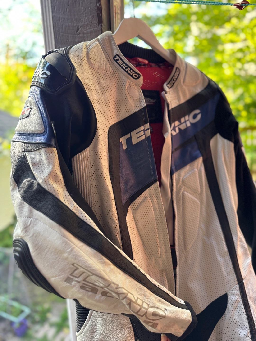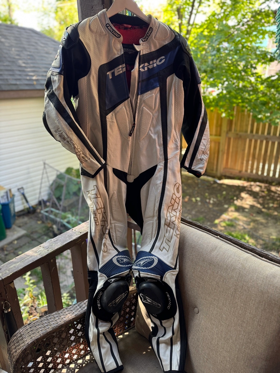 Selling a Teknic racing leather motorcycle suit. It's in great shape and ready for the track or the open road! The suit is white, black, and blue. It has Teknic logos on the front, back, and legs. Minor scratches on knees (see pictures) but otherwise in excellent used condition.