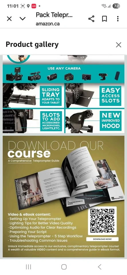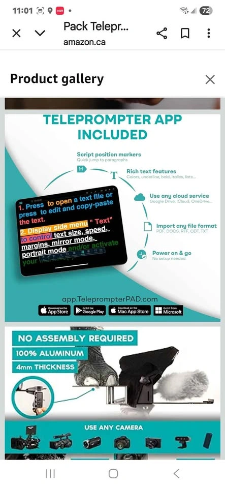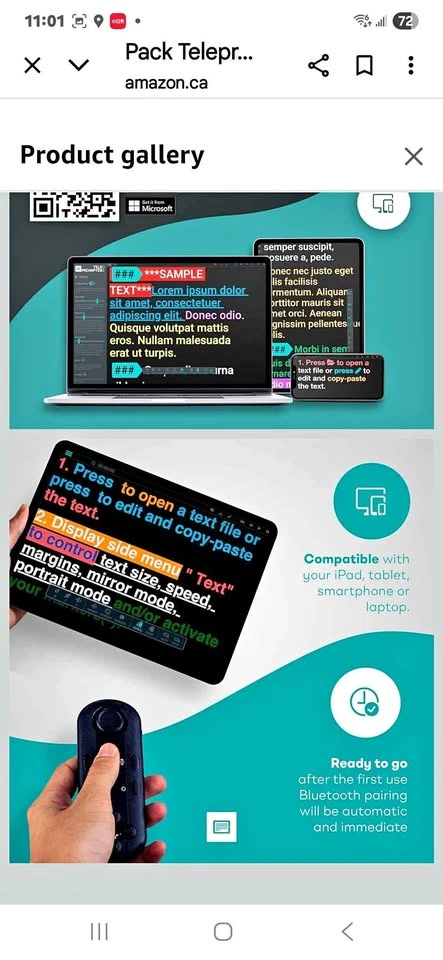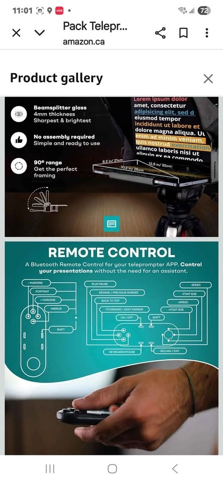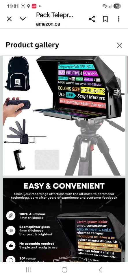 64Great condition TELEPROMPTER PAD iLight PRO 12". Model Name iLight PRO 12" Compatible with all Tablets/Smartphones with dimensions up to 20cm x 26cm including iPad 10'', iPad 10.2'', iPad Air 10.5'', iPad Pro 11'', iPad mini. Compatible with all handheld cameras (DSLR, HDVCAM, XDCAM, NXCAM) and with video and photo tripods. I don't know if I can still find the remote control, because I almost never used it myself.
