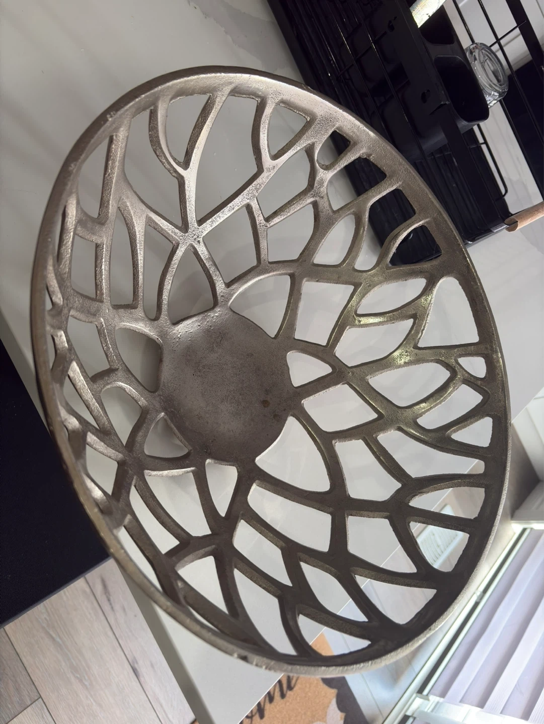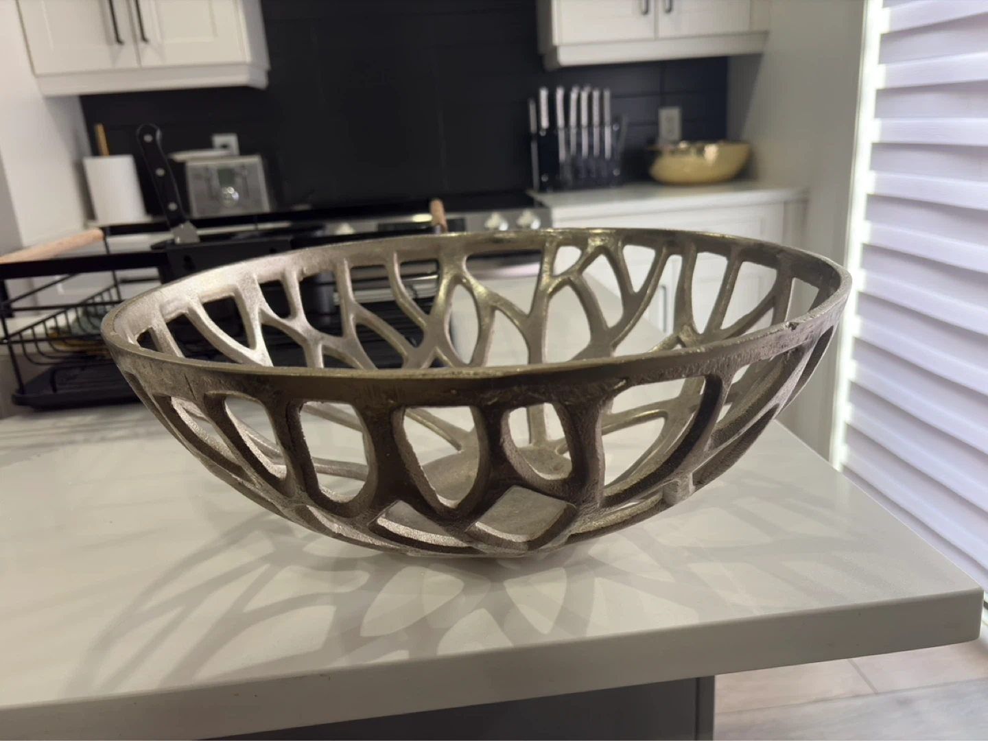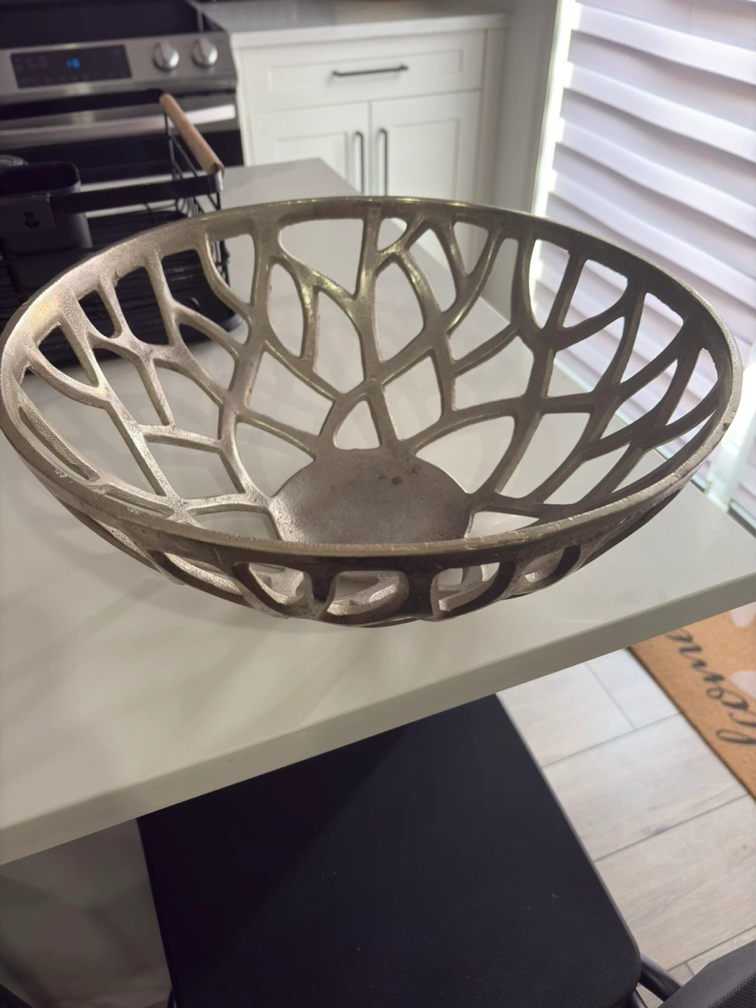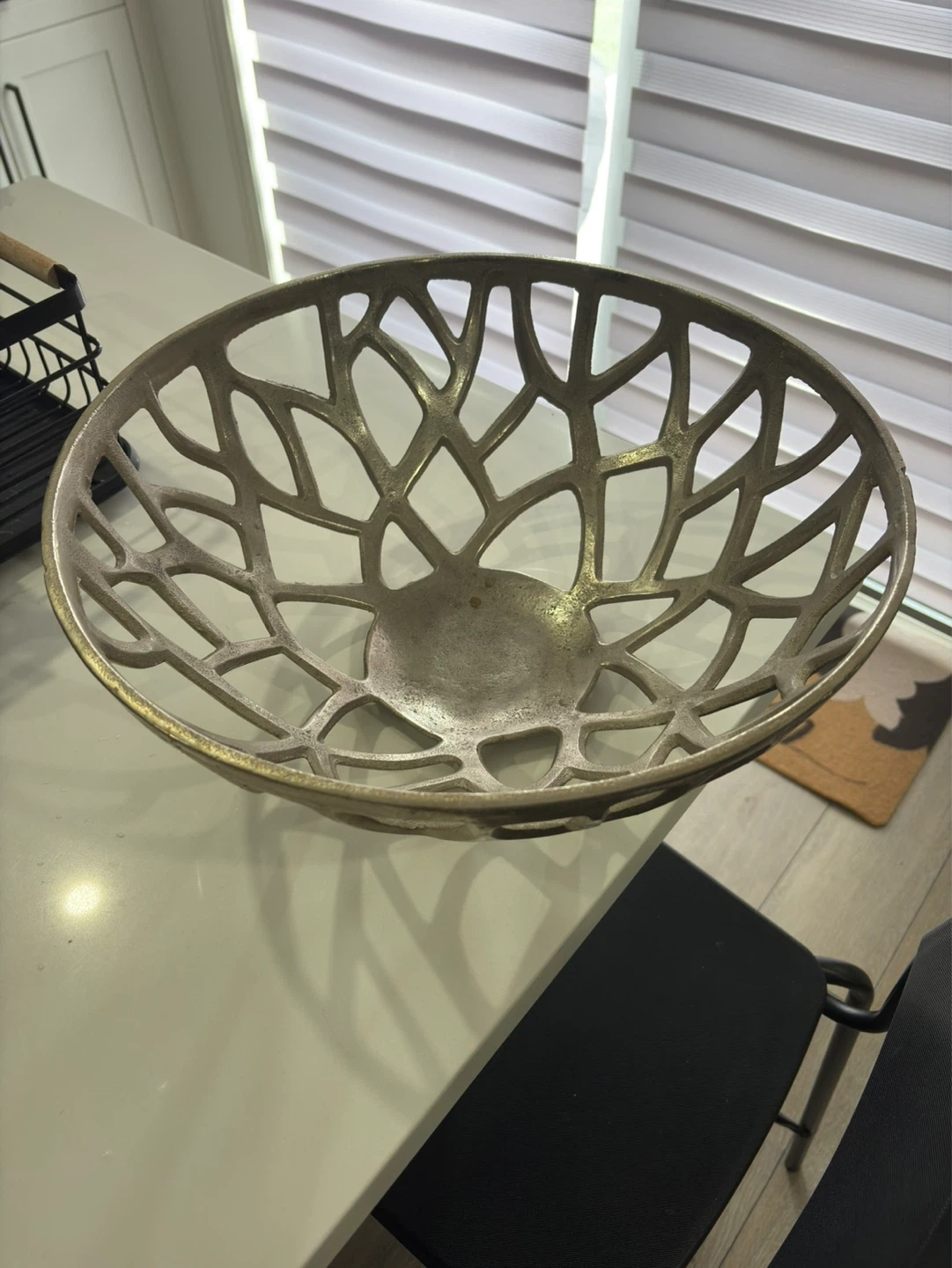 A decorative metal bowl with an intricate cutout pattern. It's a silver-toned finish. Great for fruit or as a display piece on a table.