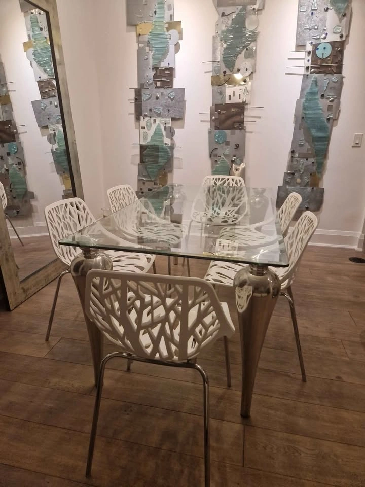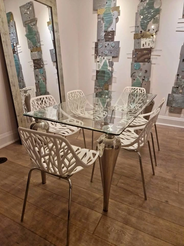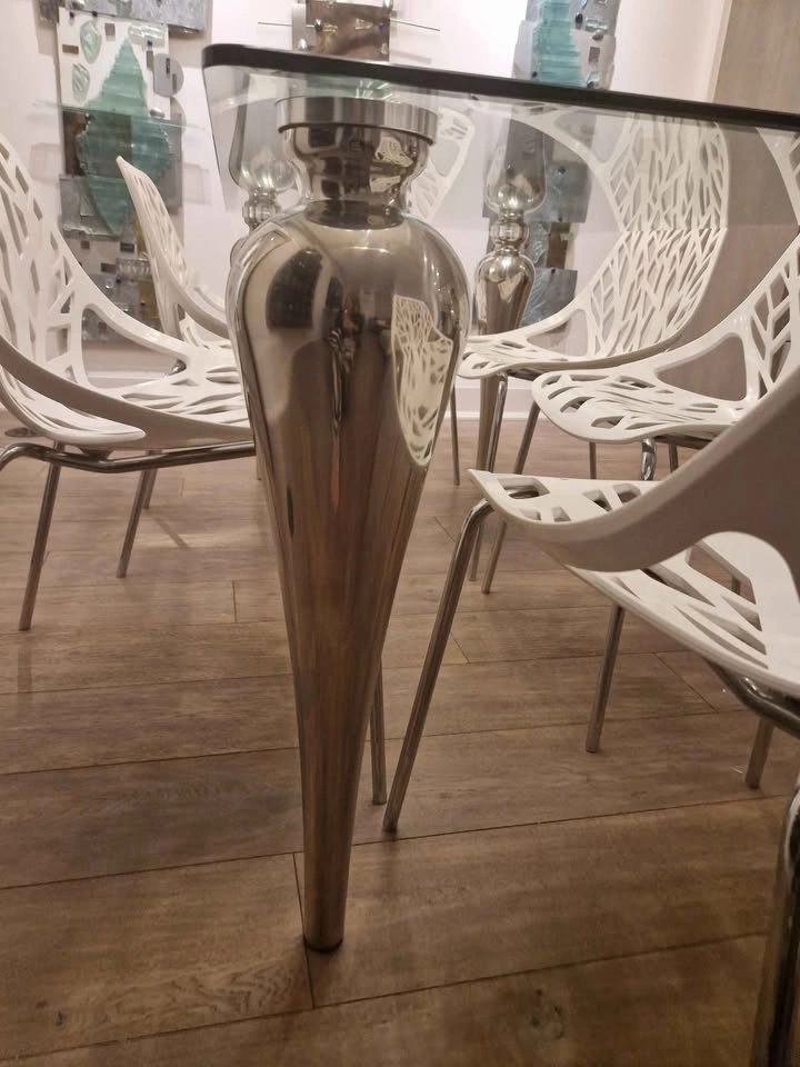 Tempered glass top with shiny silver legs (detachable for easy transport). Includes 6 sturdy modern chairs made of durable molded plastic with chrome legs. Stylish, easy to clean, and perfect for a modern dining space or office. 180x90 cm