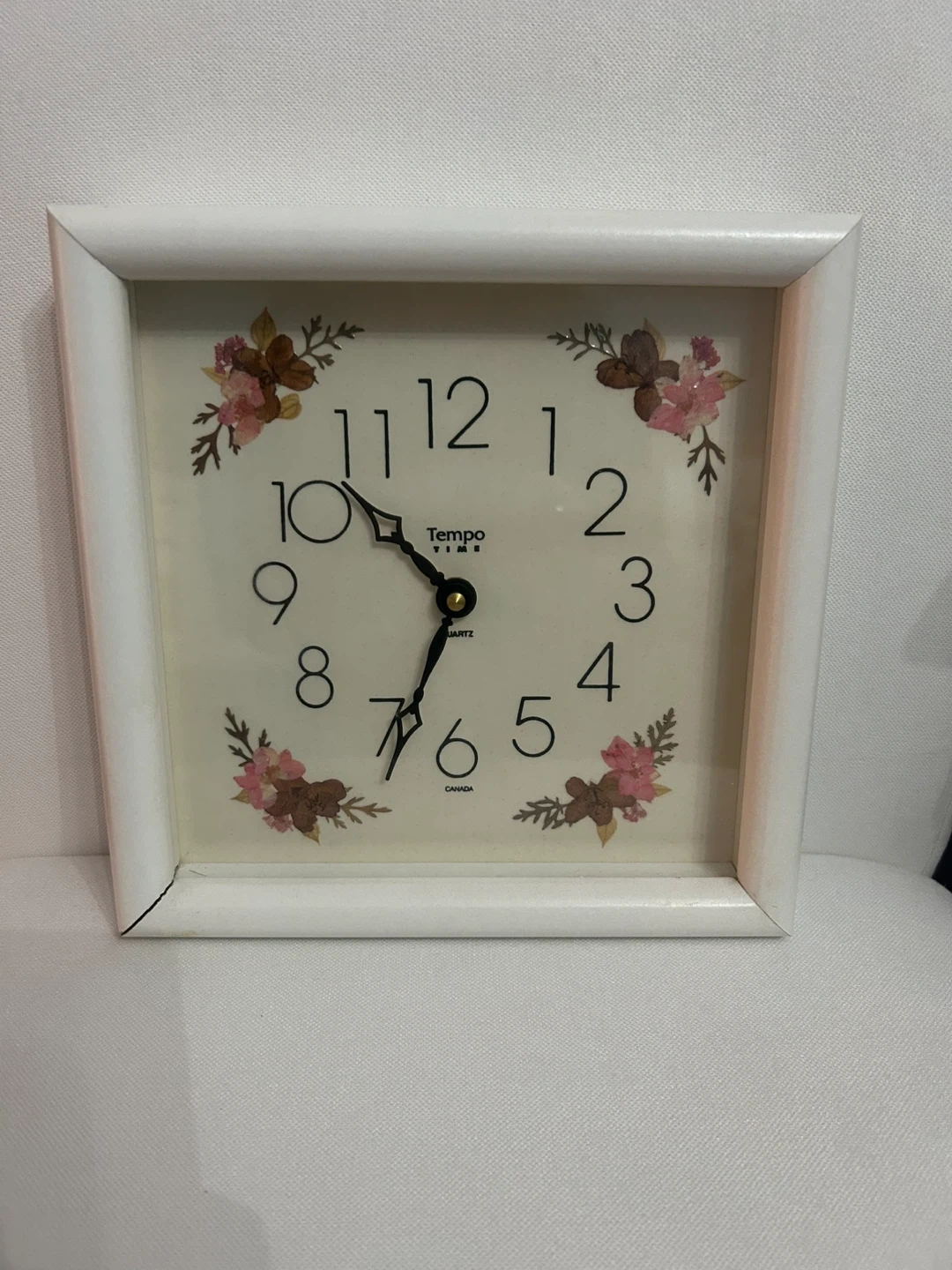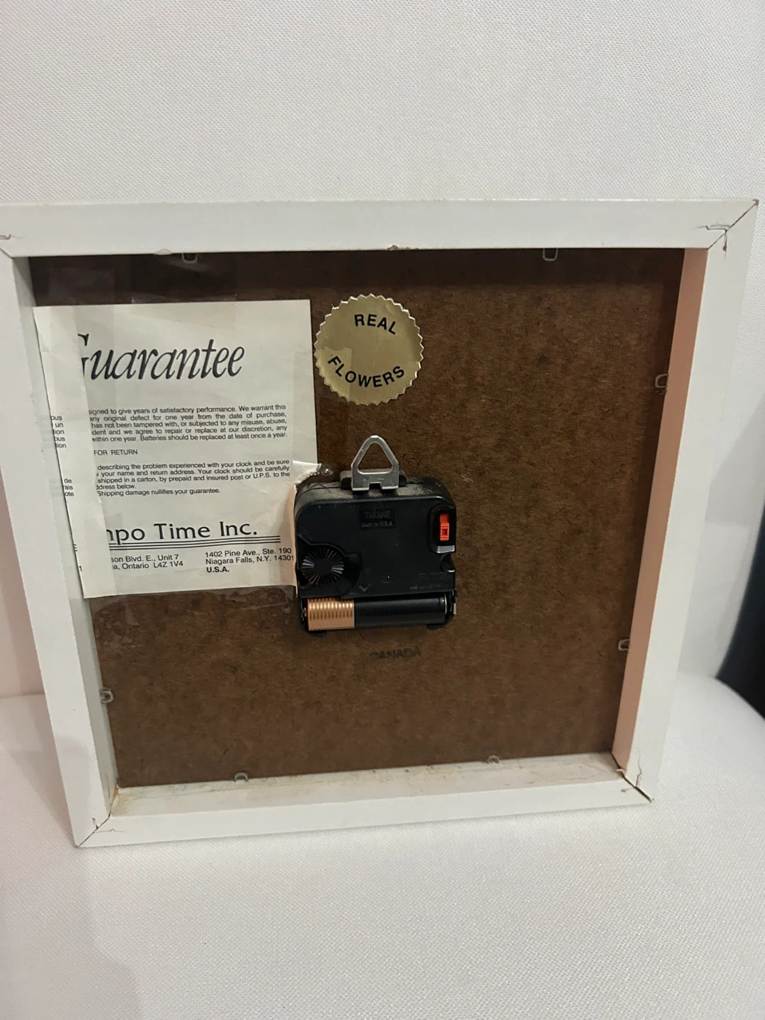 Selling a Tempo Time Inc. quartz clock with a floral design. It has a white frame and a square face with floral accents around the numbers