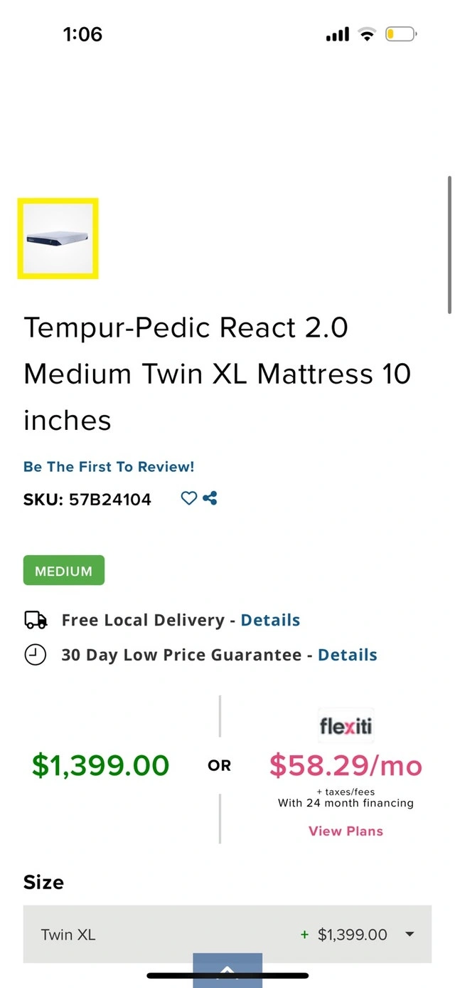 15Tempur-Pedic React 2.0 Medium Twin XL Mattress. 80" L × 38.25" W × 10" H. Also compatible with the adjustable base. Getting rid of it because we bought the wrong firmness (barely used only a month). See the Leon’s listing for more details and specifications. Original price before tax: $1,399. Asking for $700. Thank You!!