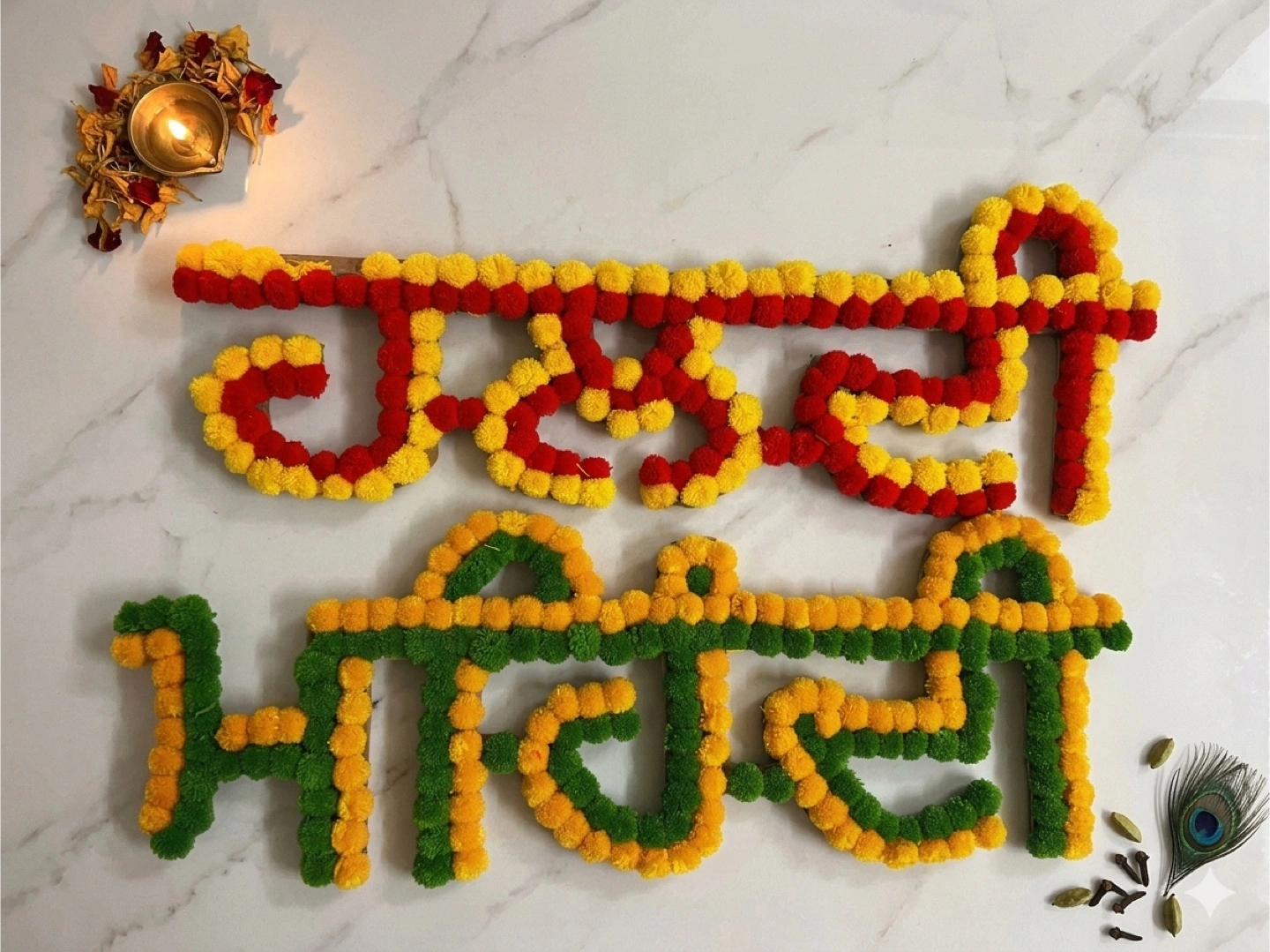 Set of two floral wall decorations made of marigolds and fabric pom-poms. Red, yellow, and green colours. Perfect for festive occasions and home decor. Adds a vibrant touch to any space!