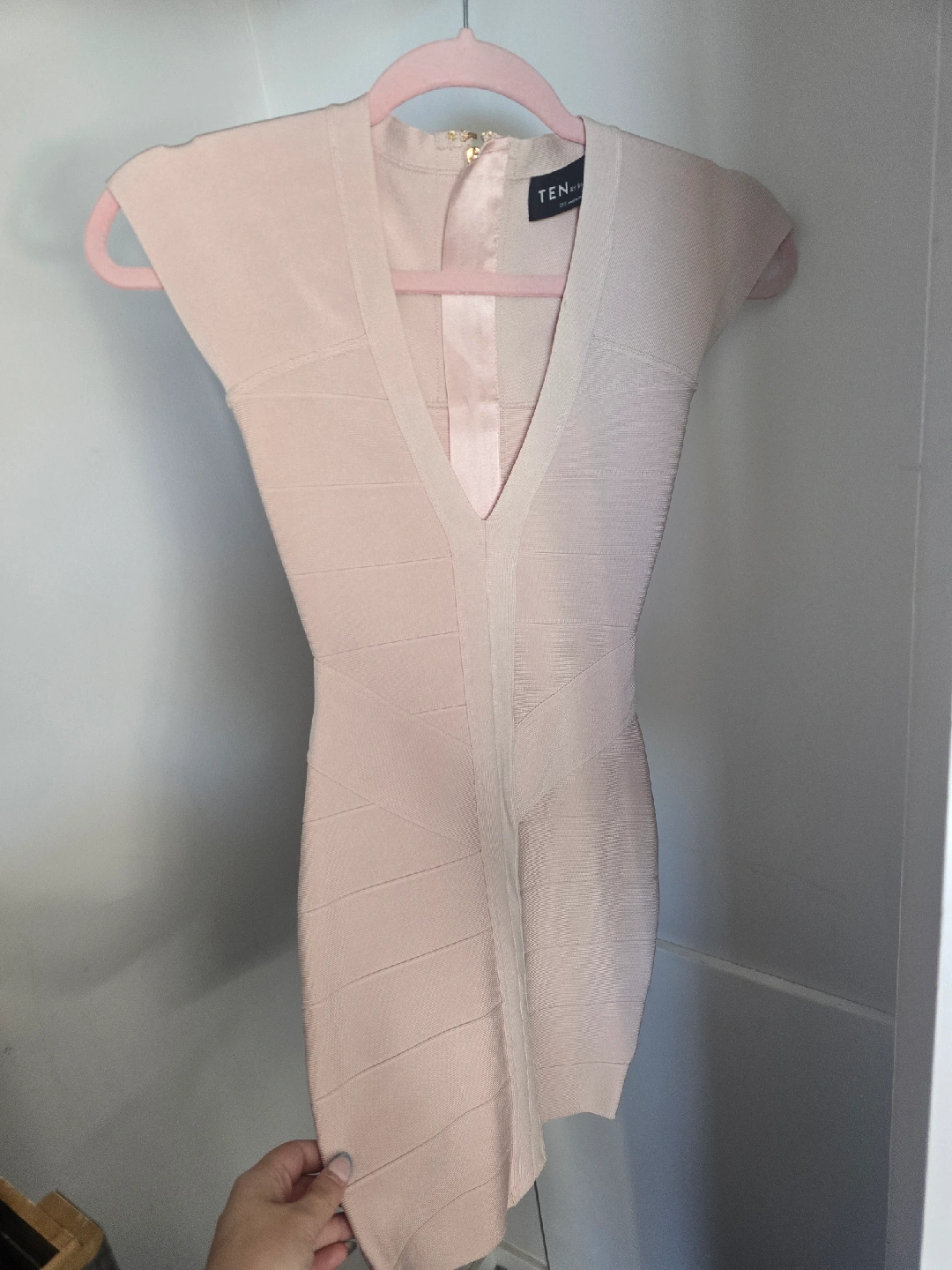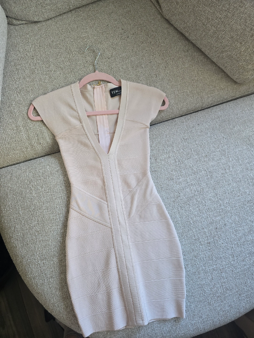 Selling a cute beige bandage dress from Aritzia. It's a size 2xs and in great condition. Perfect for a night out or a special occasion. The material is stretchy and form-fitting, really accentuating your figure. Let me know if you're interested!