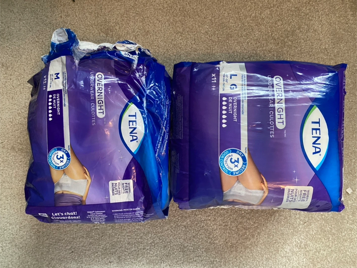 10Selling two packs of Tena Overnight Underwear. One pack is size Medium (x12) and the other is size Large (x11). The Medium pack has been opened but I’m not sure if any of them have been removed, as it still looks full. Pickup near Apto/Phelpston/Anten Mills. Delivery available at a minimal extra cost.