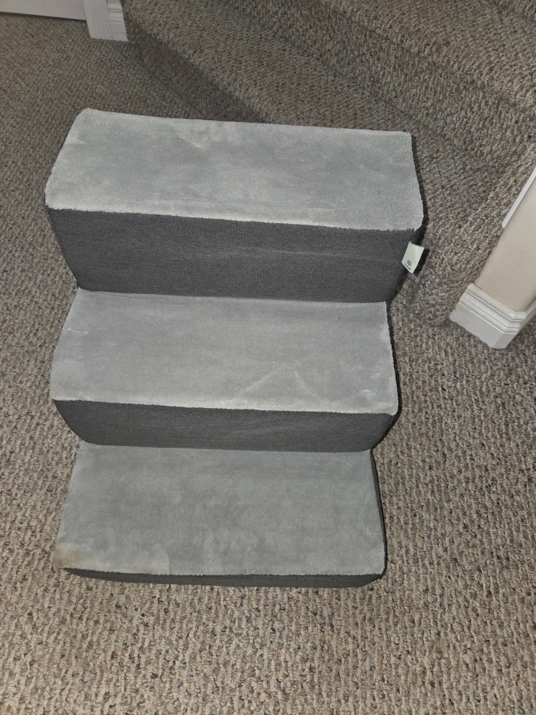 Three-step pet stairs in charcoal grey. These stairs are made with foam and covered in fabric. They're a great way to help pets reach high places! Perfect for senior dogs