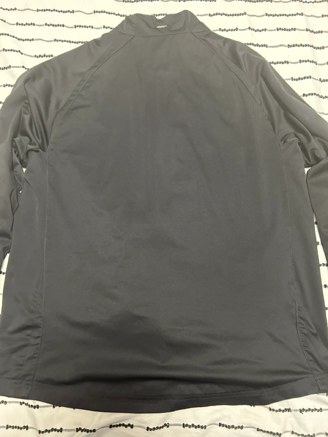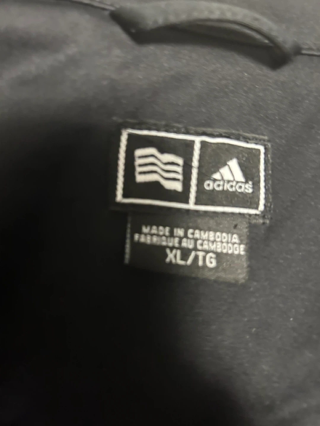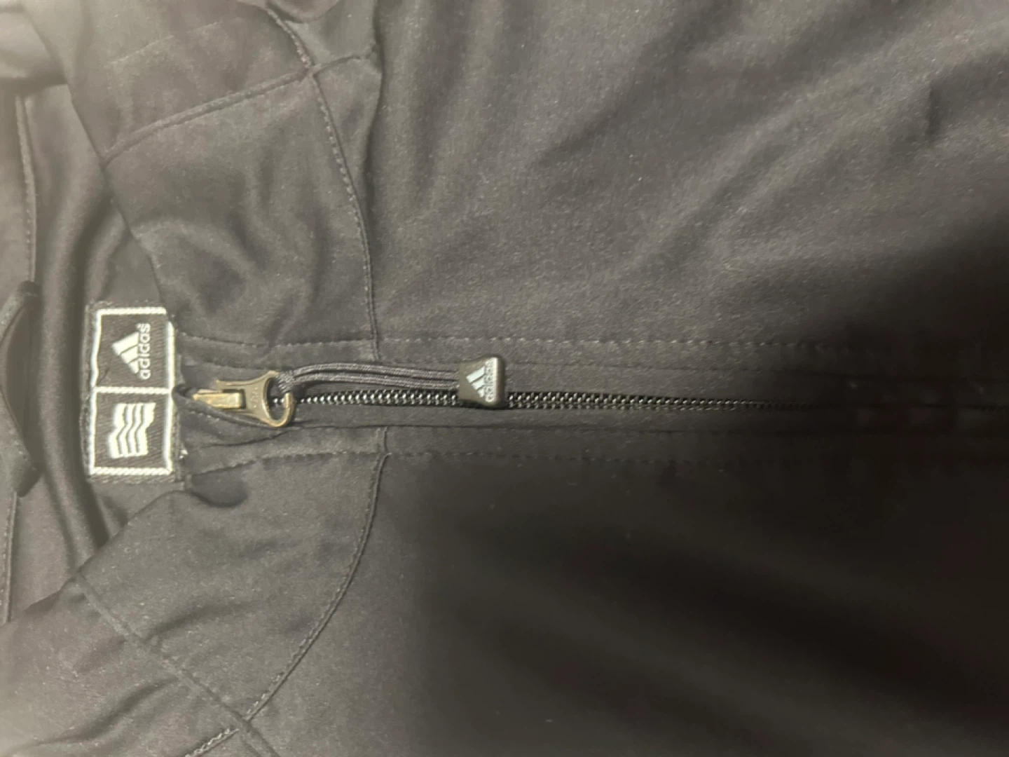 Black Adidas track jacket with the signature three stripes on the sleeves. It's made of a smooth material with a full zipper closure and zippered pockets. This jacket is great for workouts or casual wear.