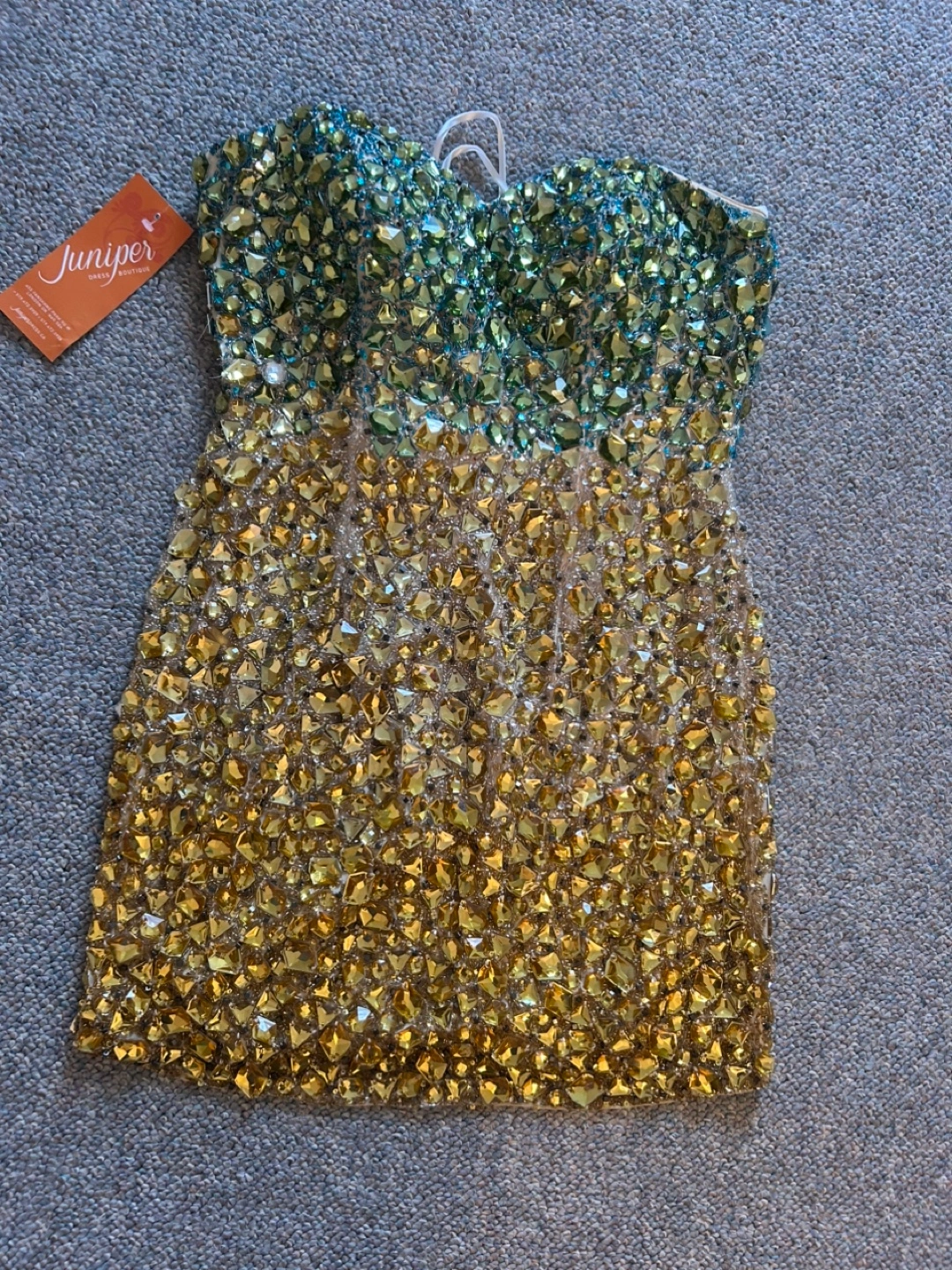 Brand New,Stunning mini dress. Features a strapless neckline and ombre beading in teal and gold. Fully beaded bodice and skirt. Size 4.