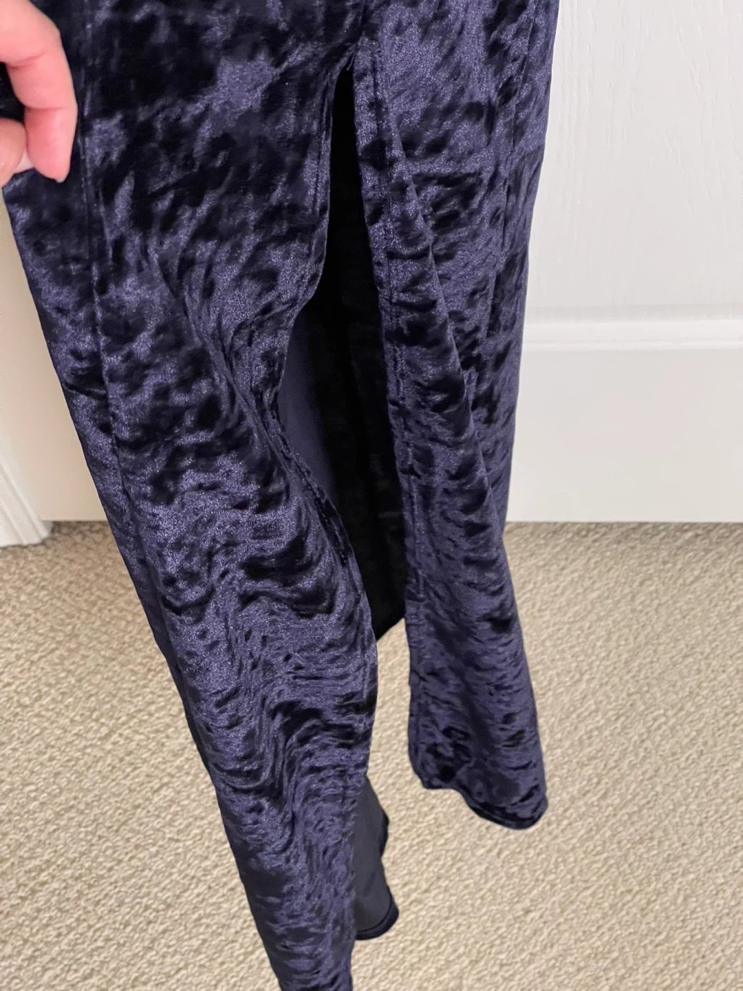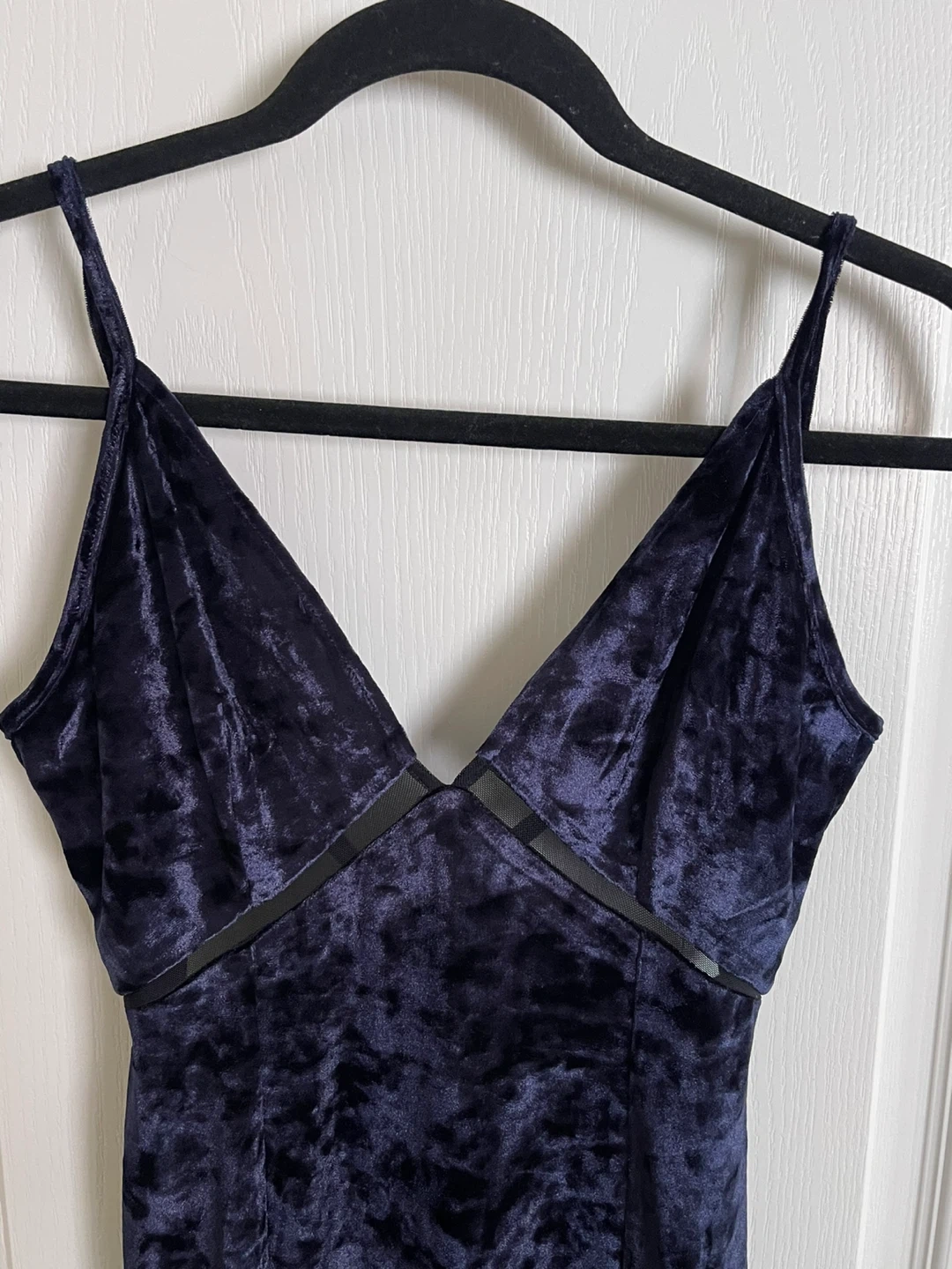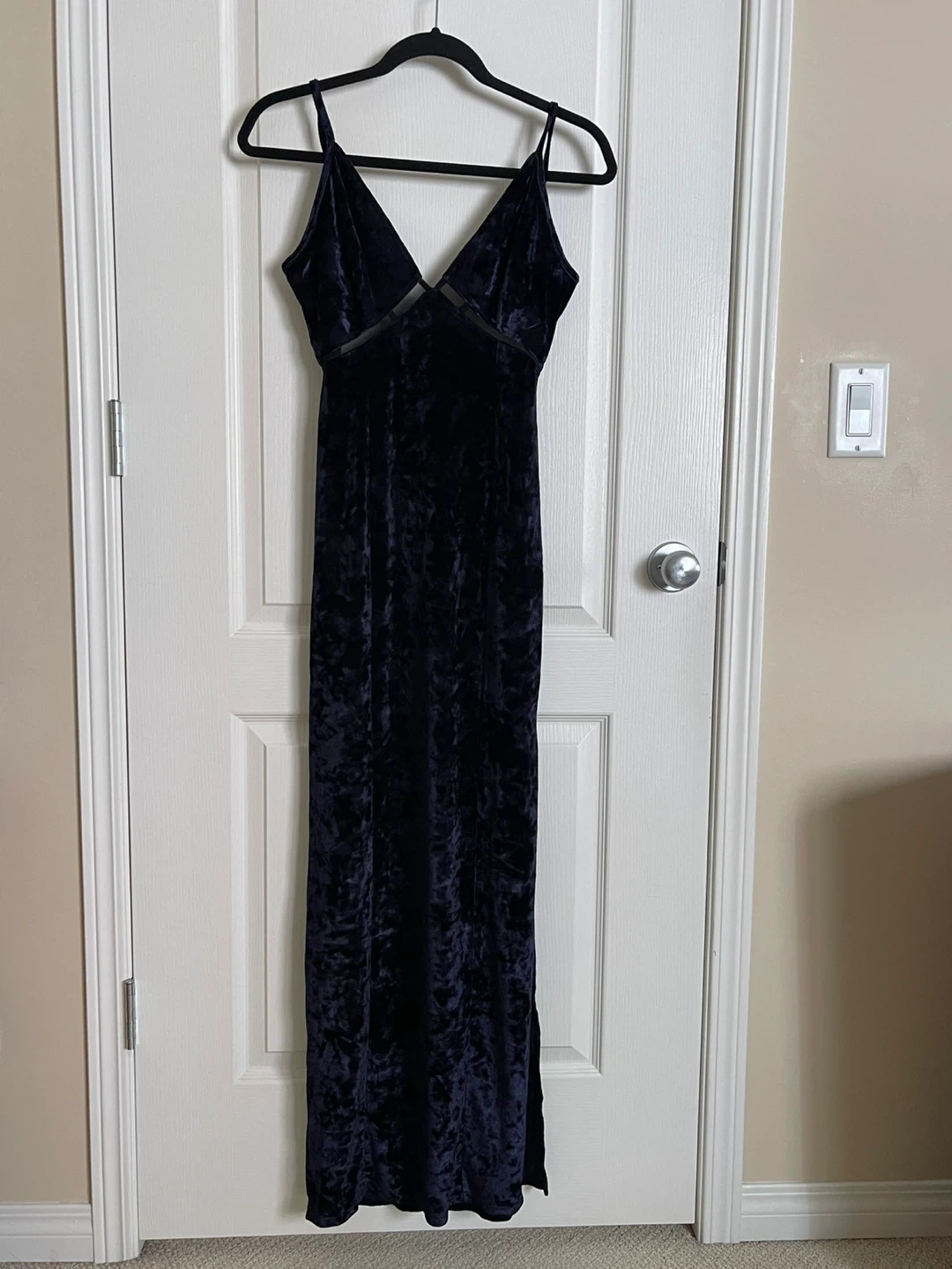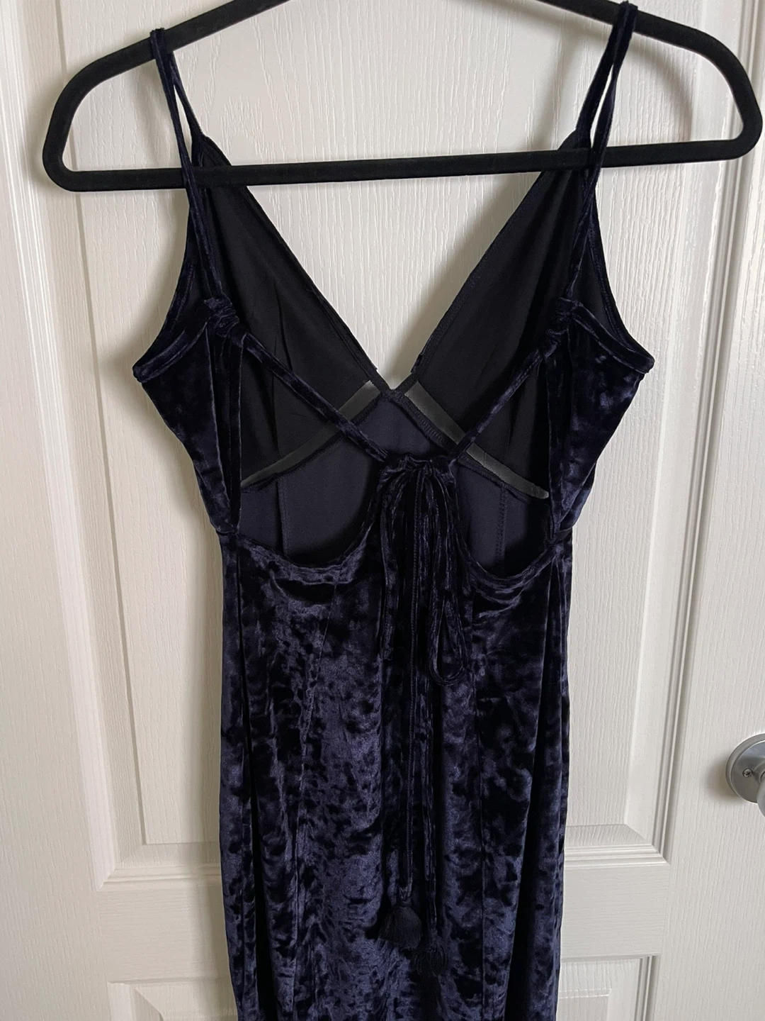 Navy blue velvet maxi dress with spaghetti straps and a V-neck. It features a side slit and a tie-back closure. Material is velvet. Worn once.