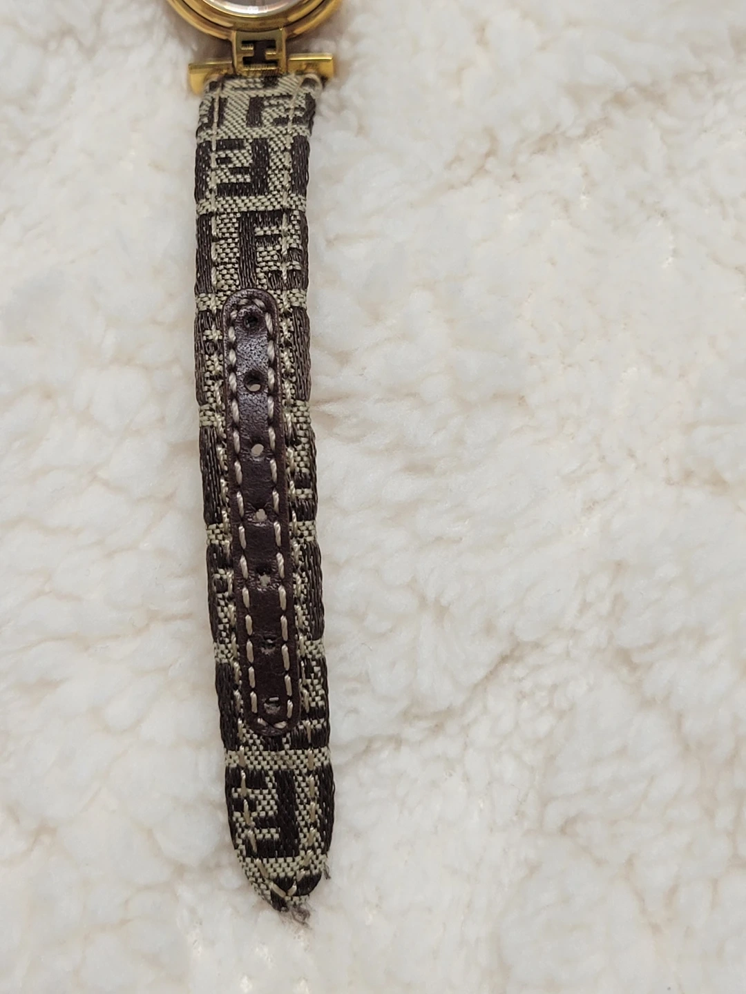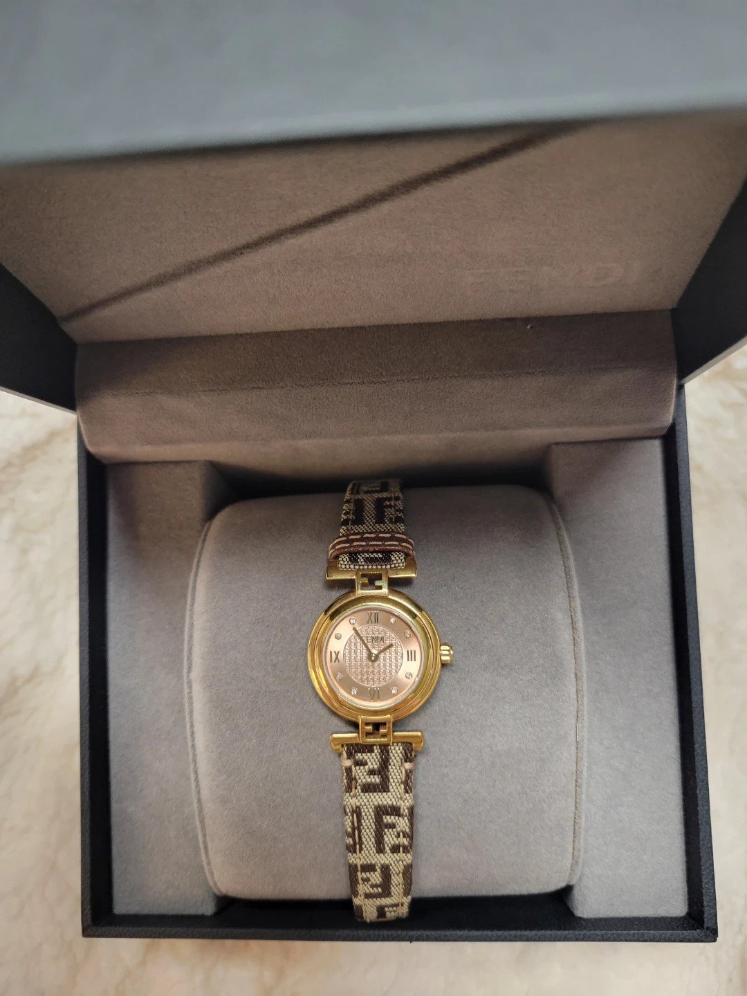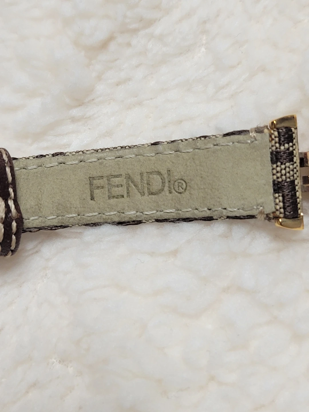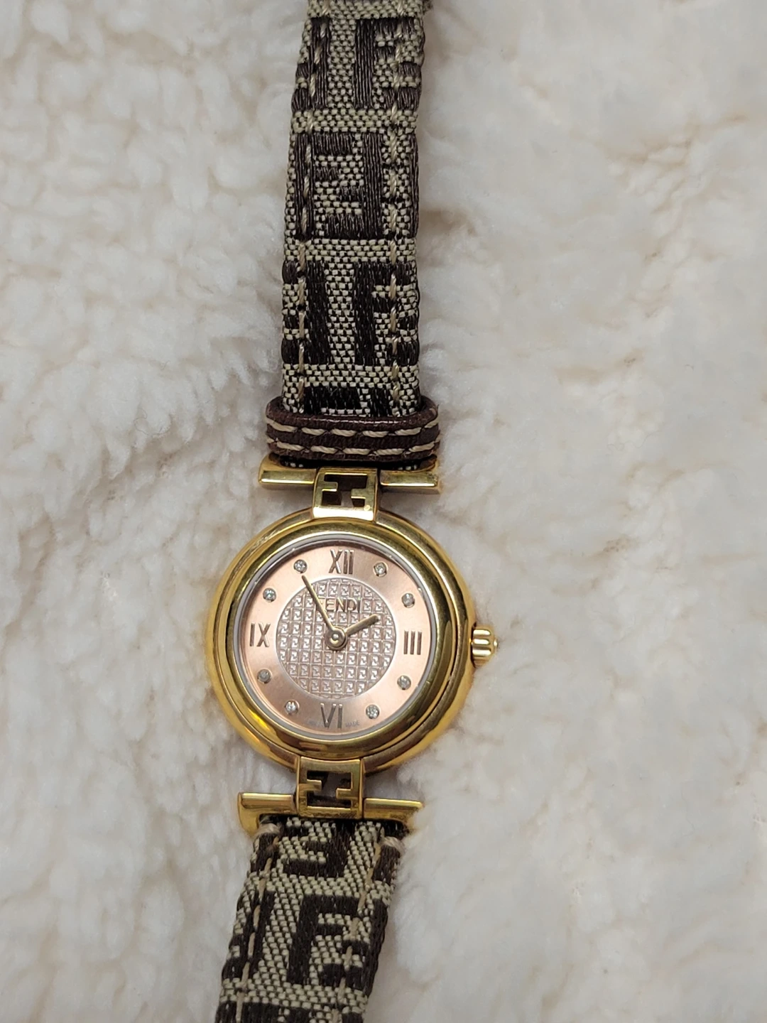 This Fendi watch features the iconic F monogram pattern on its fabric and leather strap. It has a rose gold-tone case with a pink dial and diamond hour markers. Includes original box.