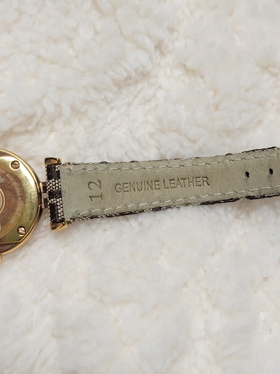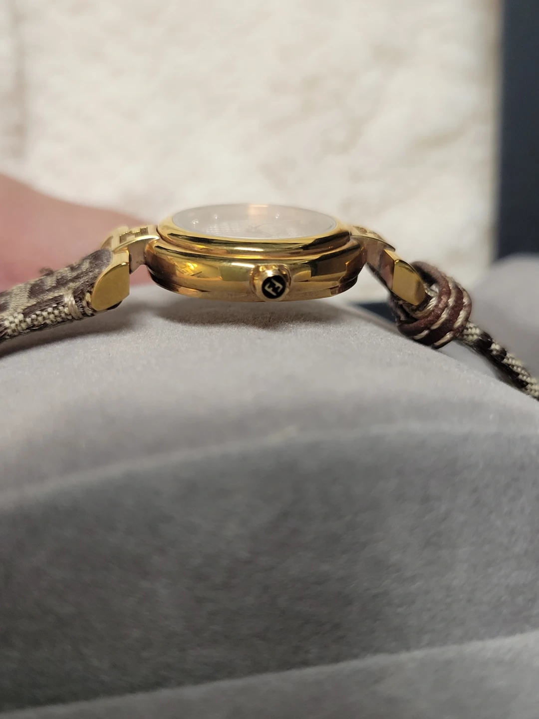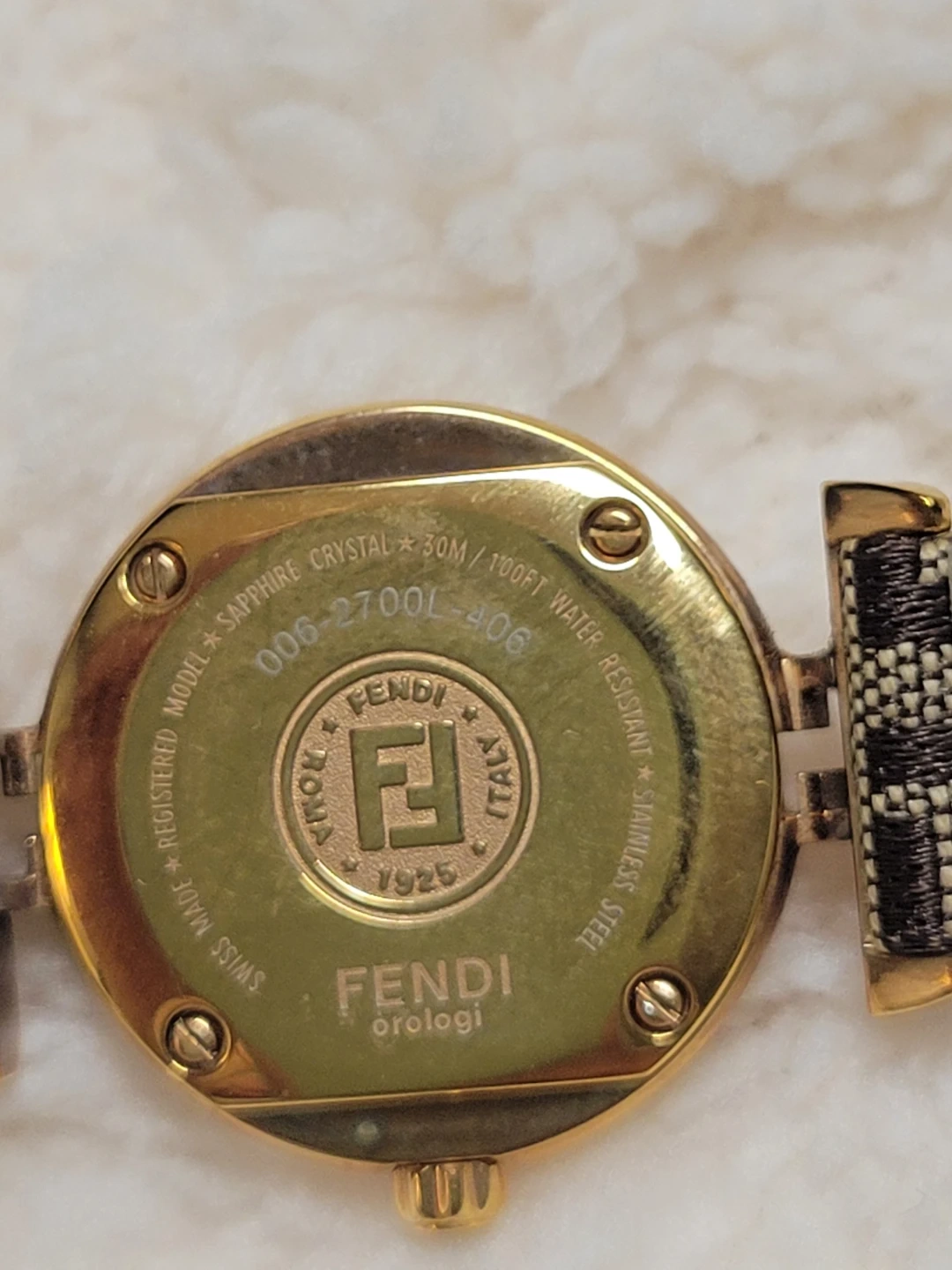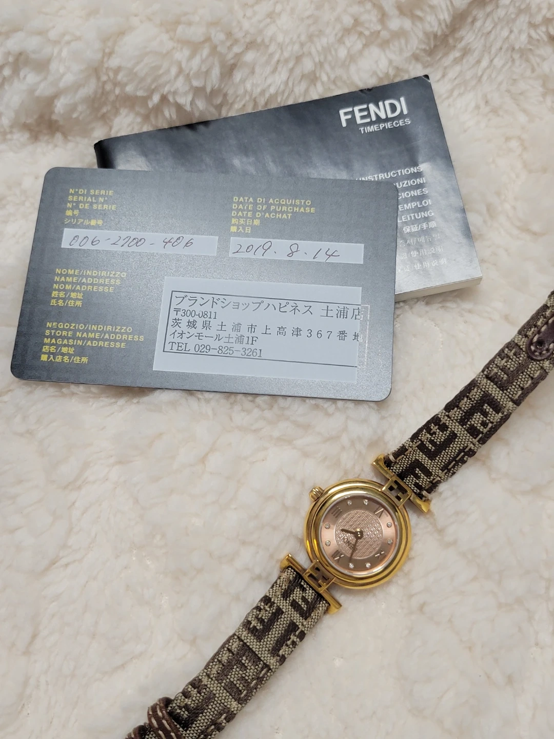 This Fendi watch features the iconic F monogram pattern on its fabric and leather strap. It has a rose gold-tone case with a pink dial and diamond hour markers. Includes original box.