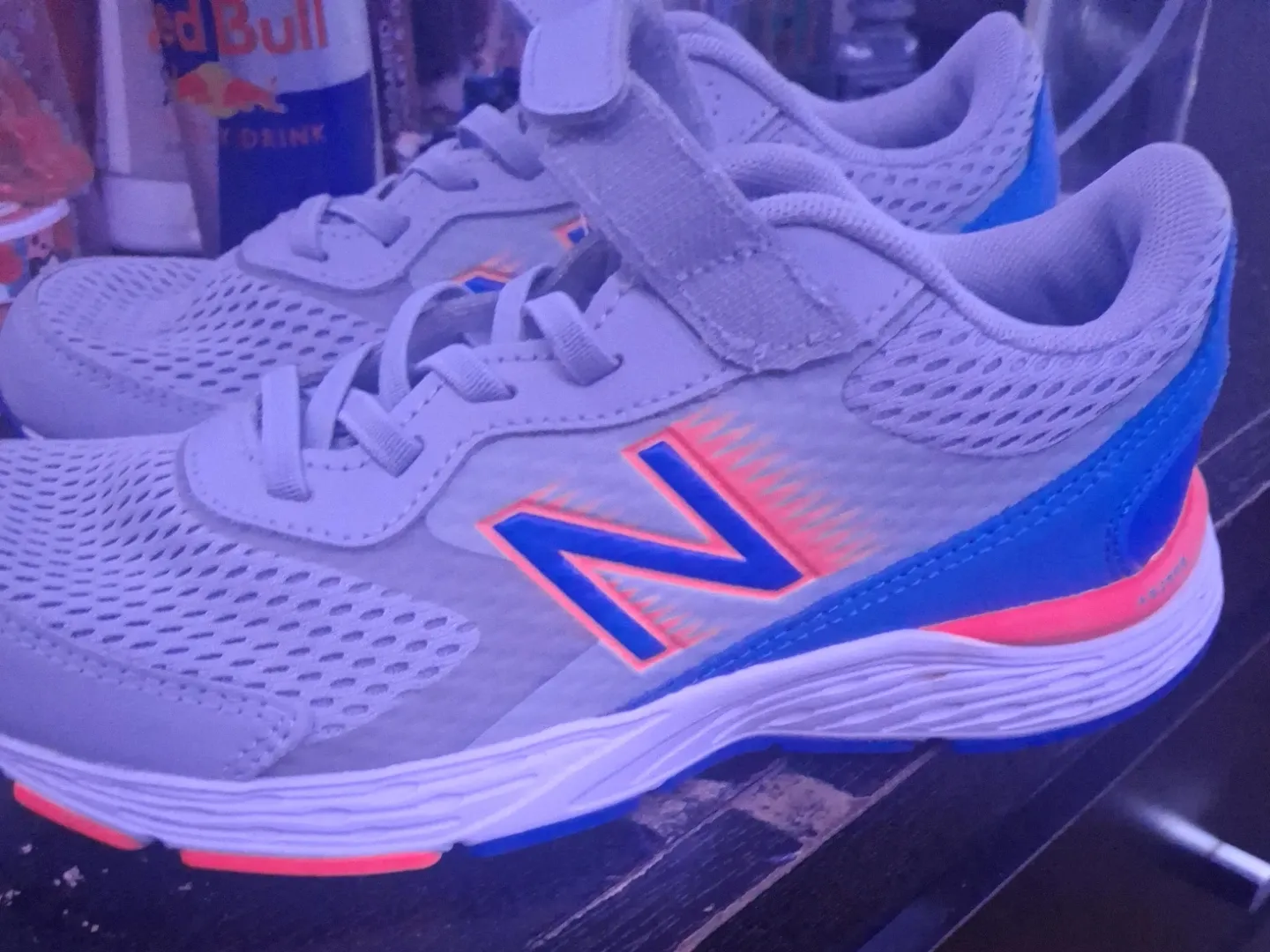 Gray New Balance running shoes for kids. Features a hook-and-loop closure for easy on and off. Mesh upper for breathability and a cushioned sole.