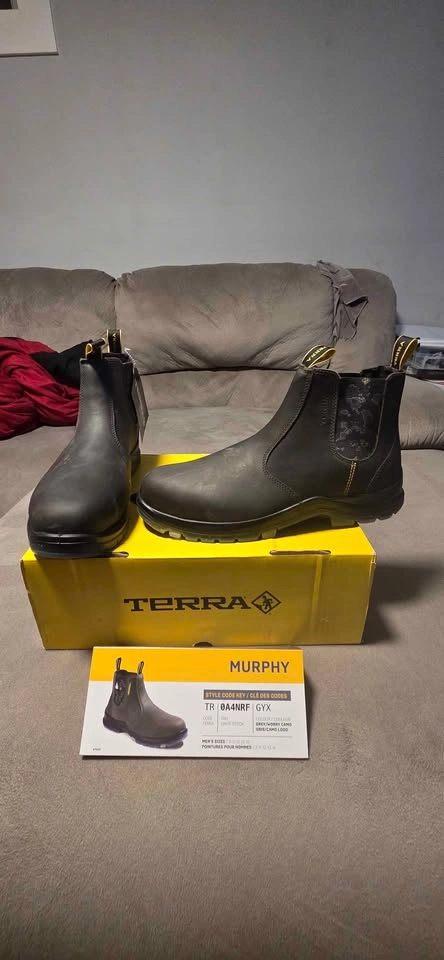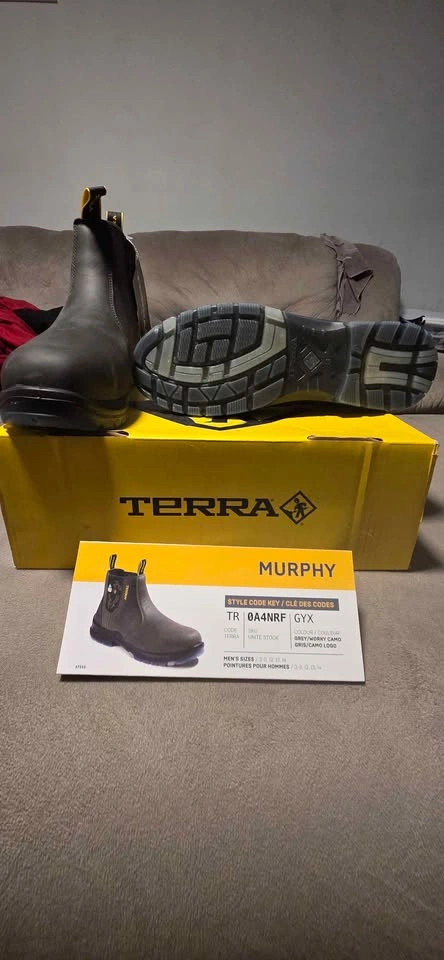 65Terra Murphy Composite Safety Toe Slip on work boots -Full-grain waterproof leather upper -Pull-on twin gore construction -moisture-wicking & abrasion-resistant lining -cleanfeet odour control treatment -Direct injected PU midsole -Slip , heat & acid resistant TPU outsole -Premium comfort dual density PU FOOTBED insole -CSA Grade 1 Composite Toe, Composite plate , ESR -Terra firma flex 100% metal free -Waterproof leather -Color : Grey worky Camo -Asking $120 firm -Serious Inquiries Only