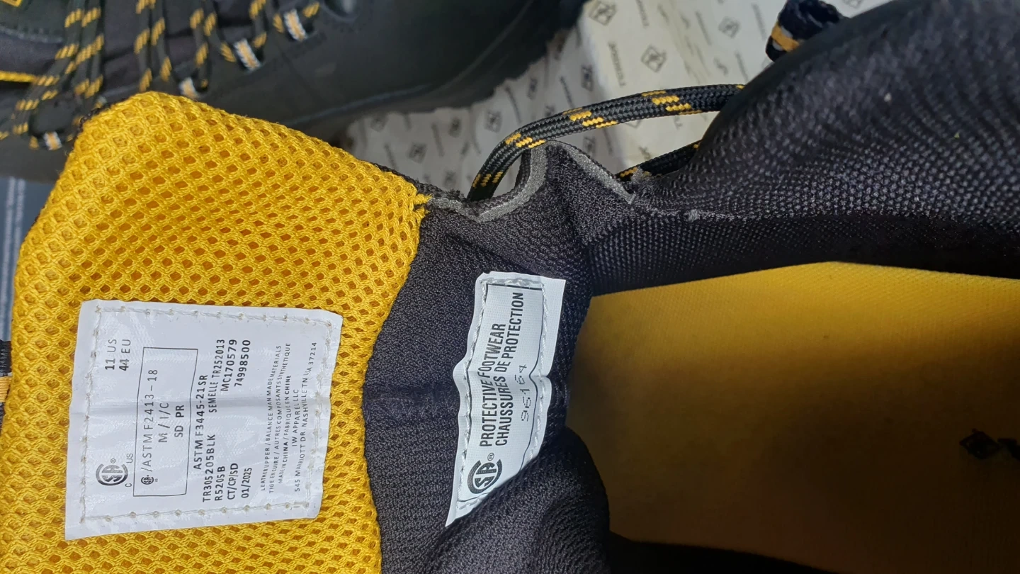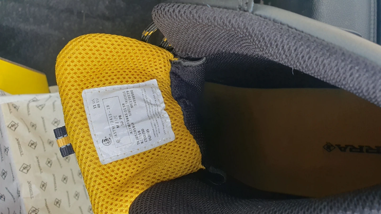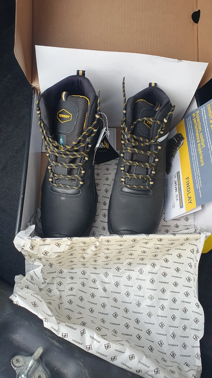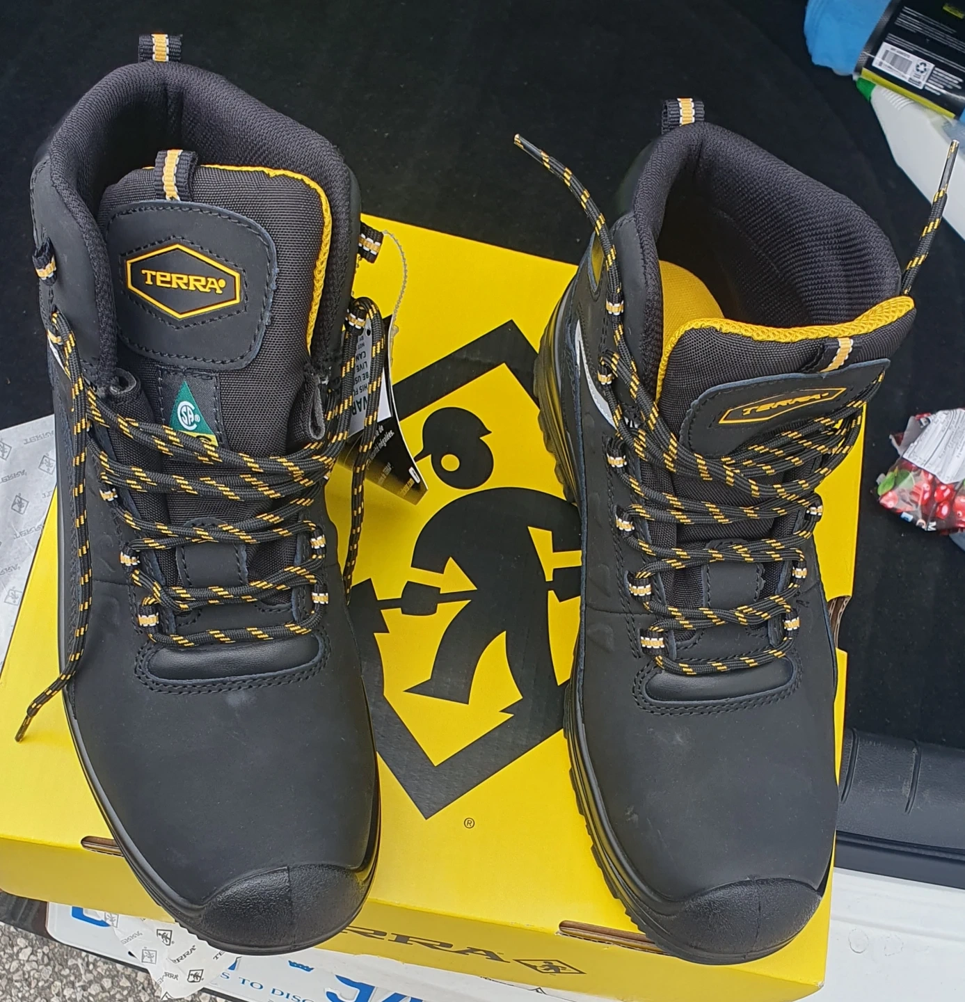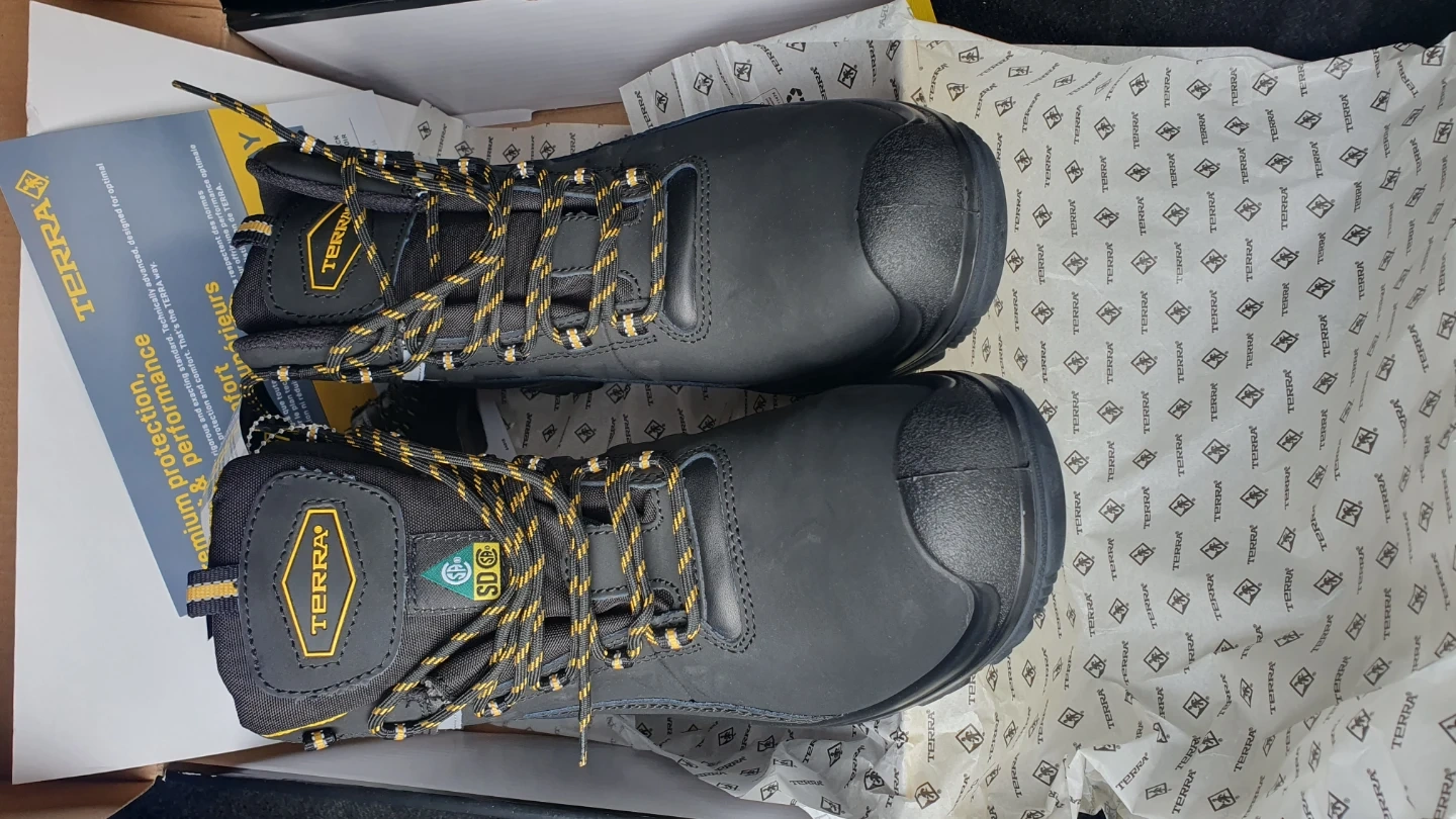60Terra work boots, size 11 US. These boots are black with yellow accents. They are brand new condition and come with the original box!