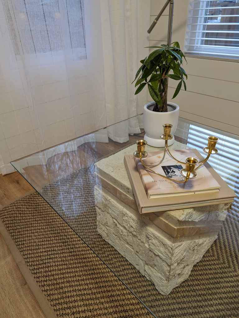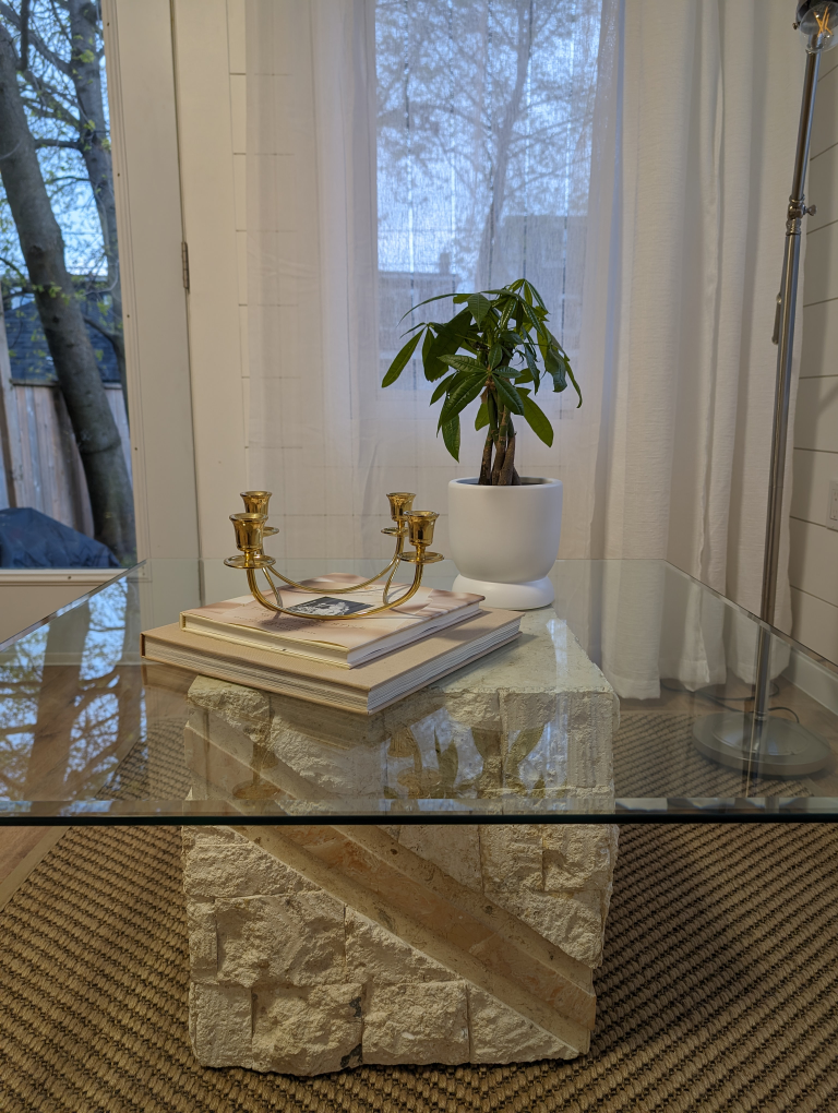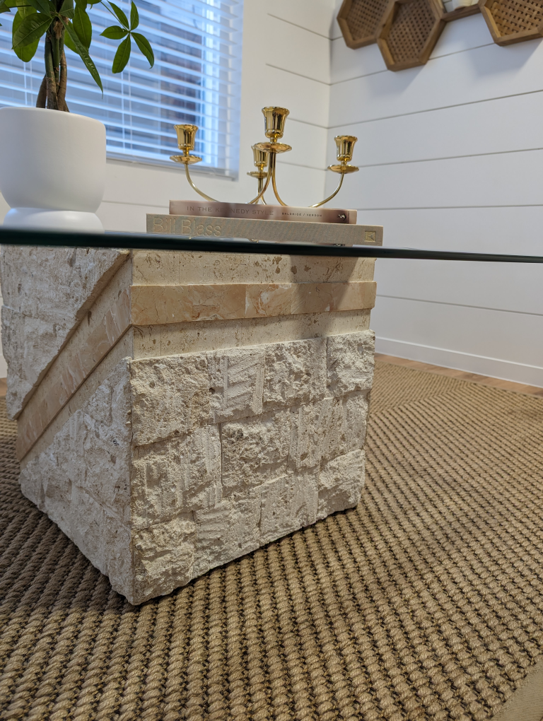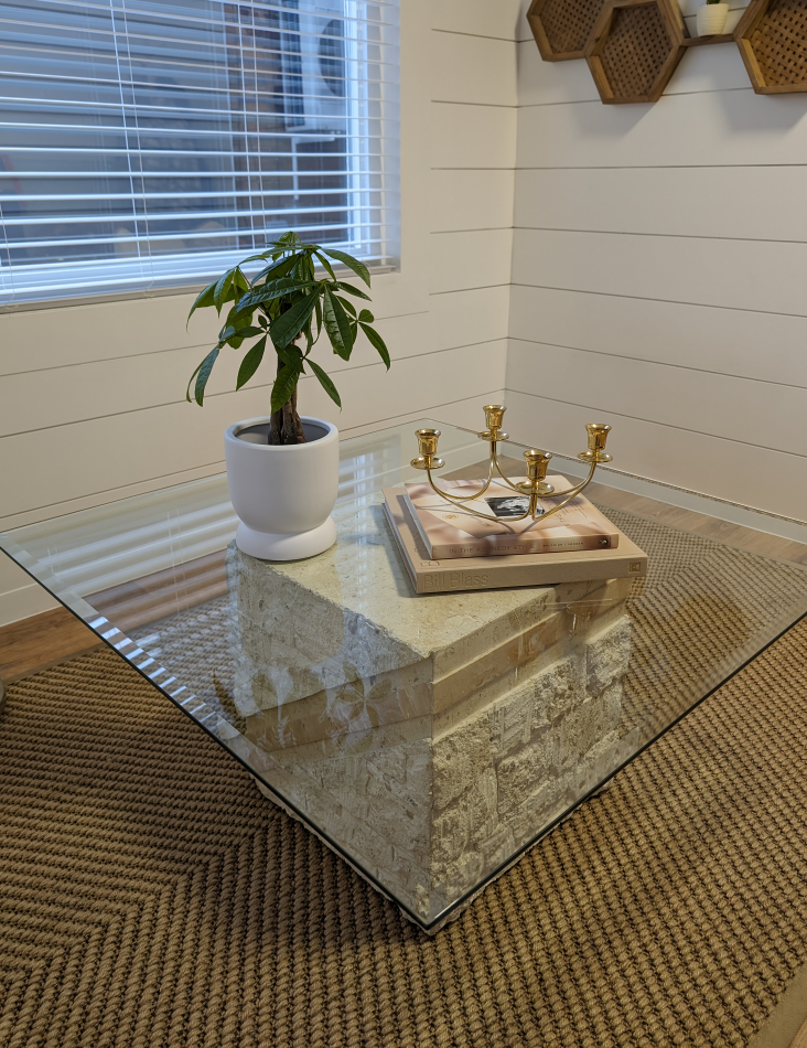 10Tessellated Mactan marble stone finish square coffee table with a diagonal light pink stripe. Thick glass top (1/2") with beveled edge Beautiful condition! Measurements: 36"x36"x16"