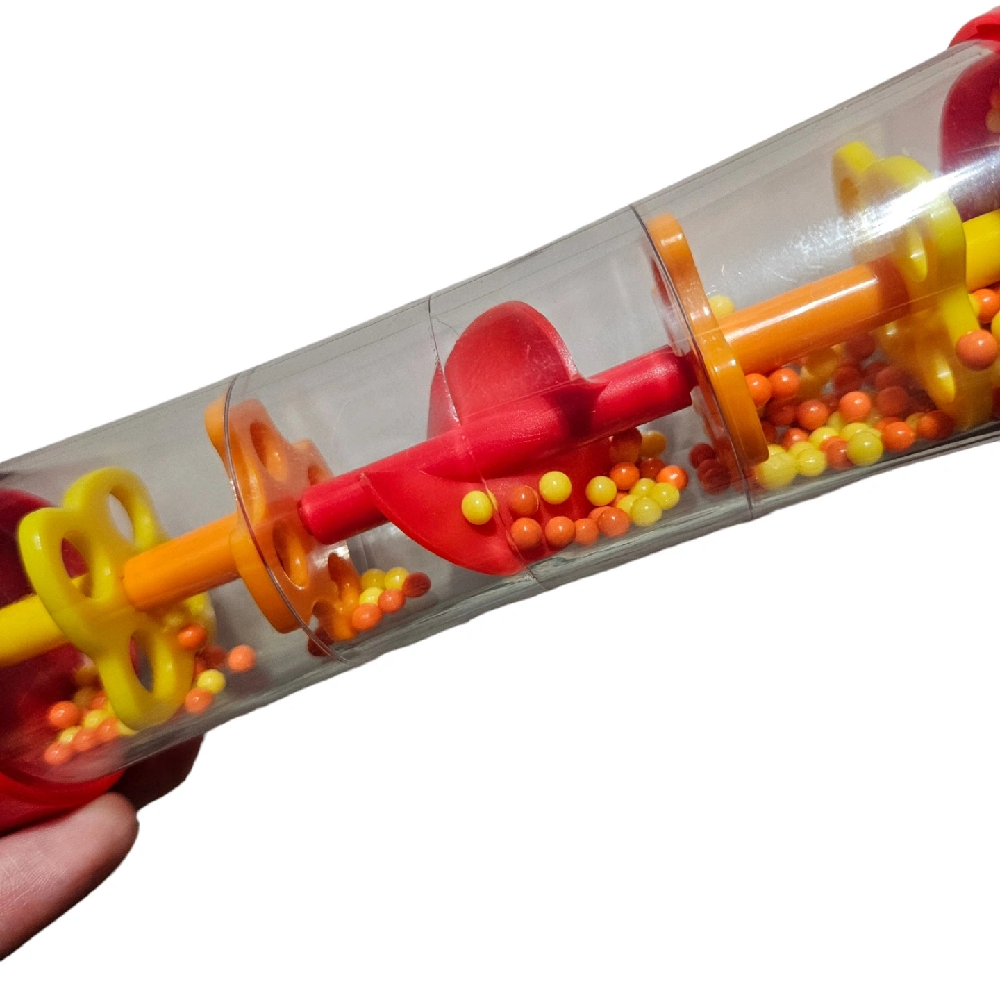 Baby toy with multiple shapes and colours. Makes a rattling sound. Great for sensory development and music exploration.