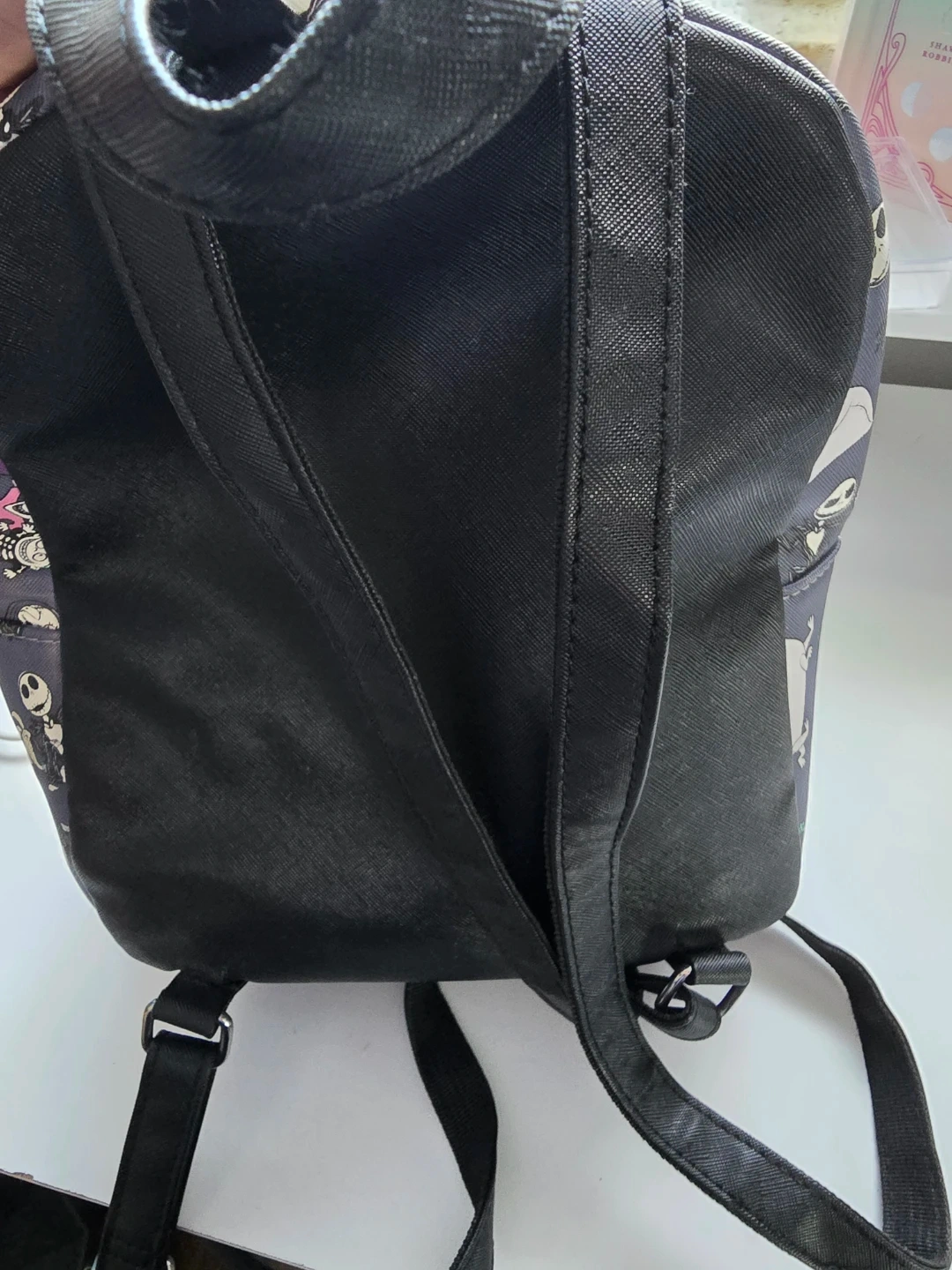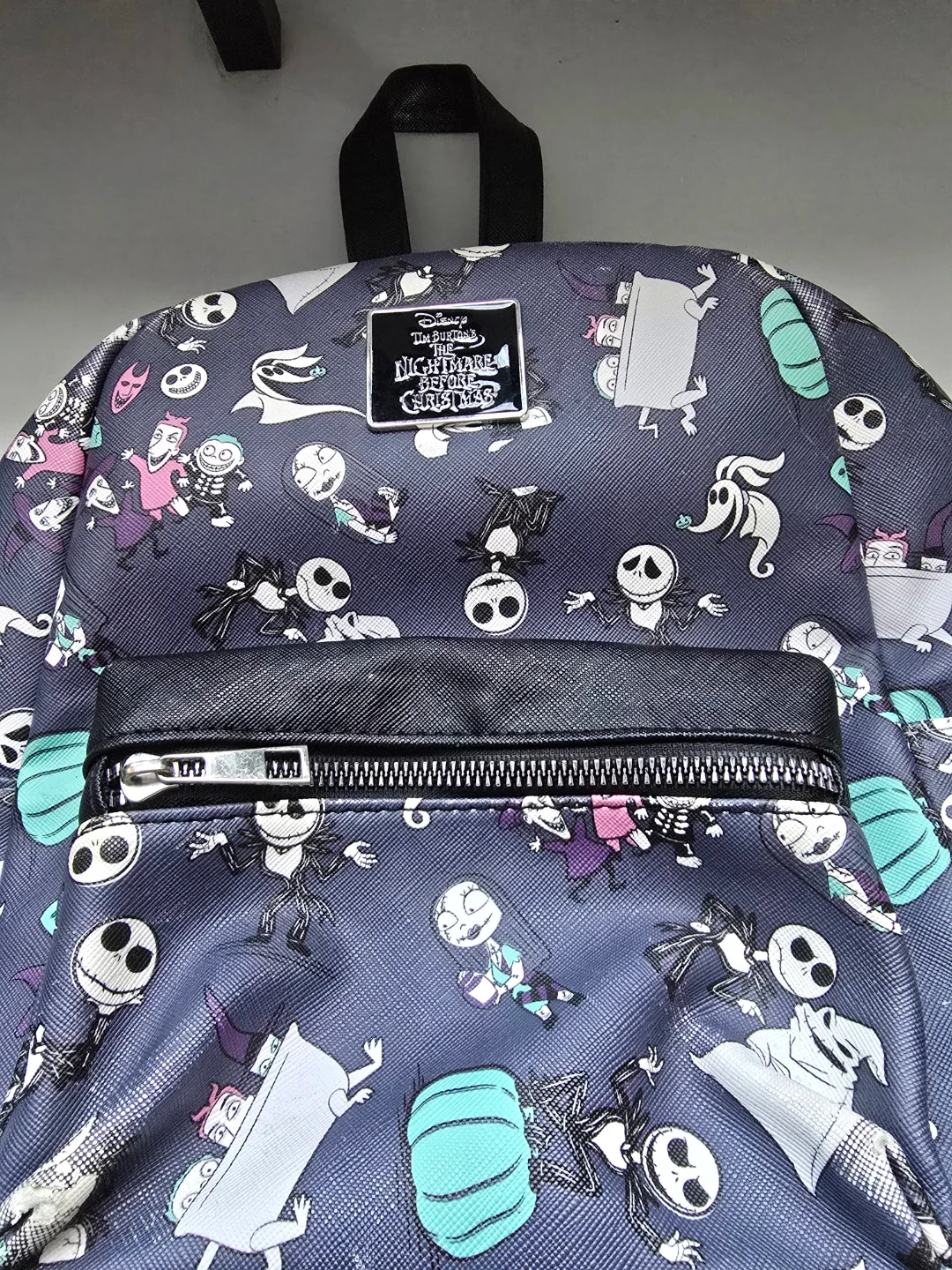 This mini backpack features a fun all-over print from The Nightmare Before Christmas. It has a zippered front pocket for easy access. A great accessory for fans of the movie!