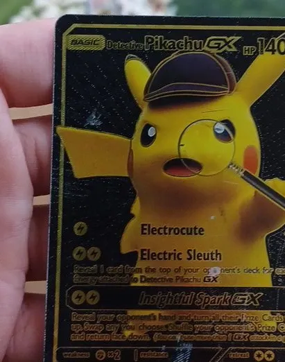 This is a Detective Pikachu GX Pokemon trading card. It features the 'Electrocute' attack and 'Insightful Spark GX' ability. HP is 140.