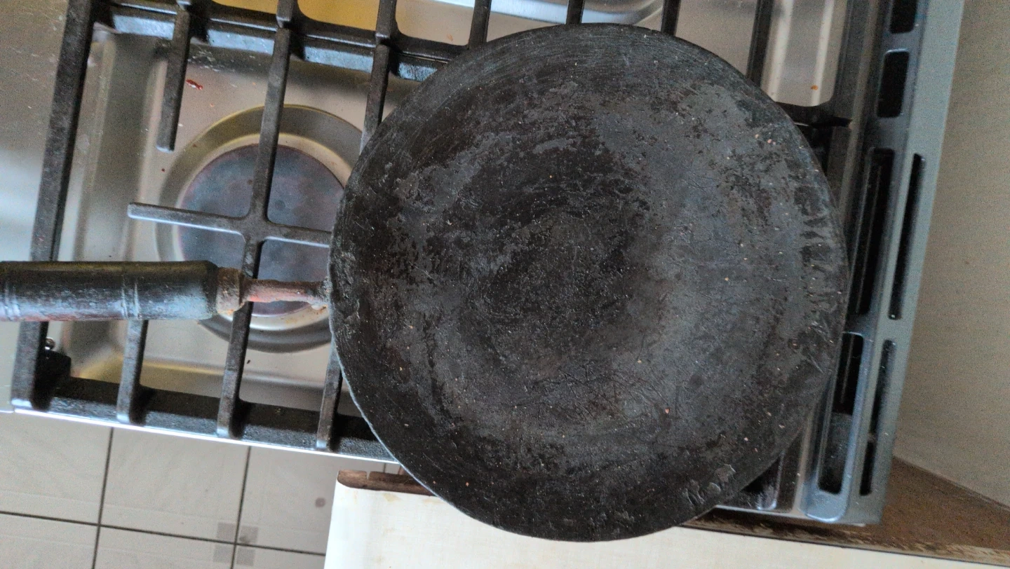 This is a round tawa or griddle, perfect for making rotis, chapatis, or pancakes. It features a sturdy wooden handle for a comfortable grip. Great for everyday use on the stovetop!