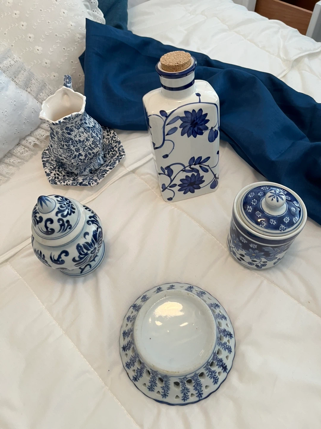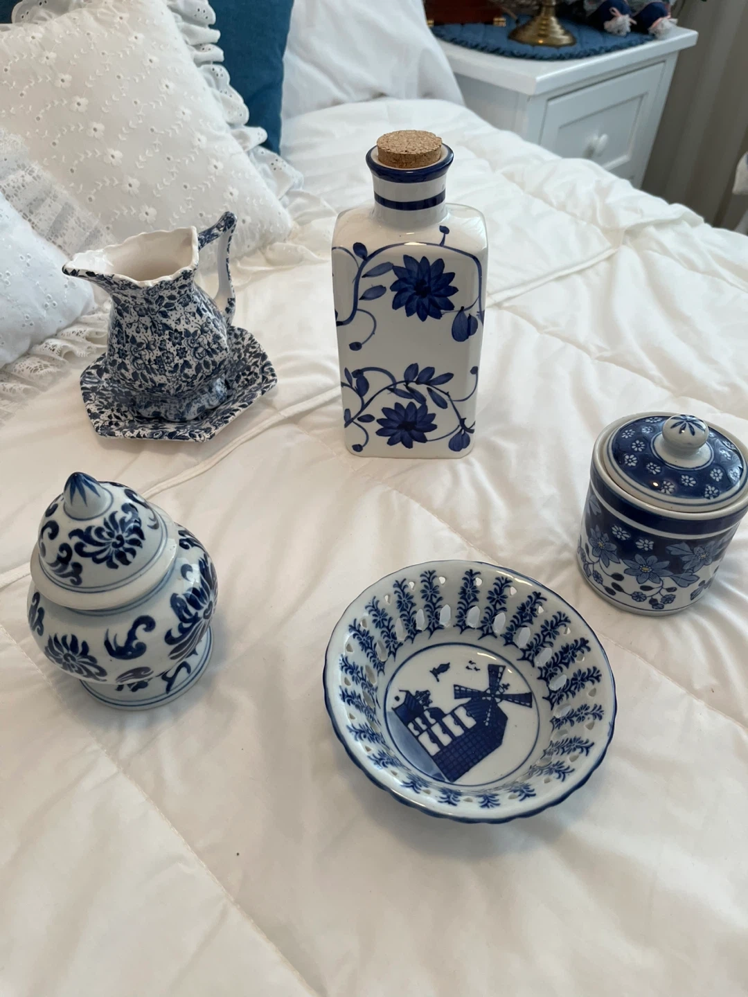 Set of decorative blue and white porcelain pieces. Includes a lidded jar, a creamer with saucer, a decorative bottle with cork, a lidded canister, and a lacy bowl with windmill detail. Perfect for adding a touch of classic style to any room!