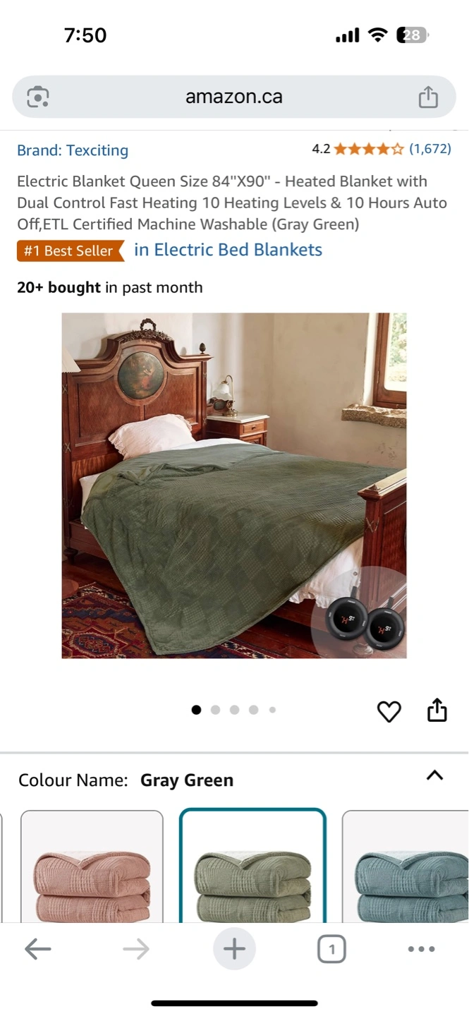 Queen size electric blanket. Heated blanket with 10 heat settings. Auto-off function. Machine washable. Gray green colour. Pickup in Wellesley street east