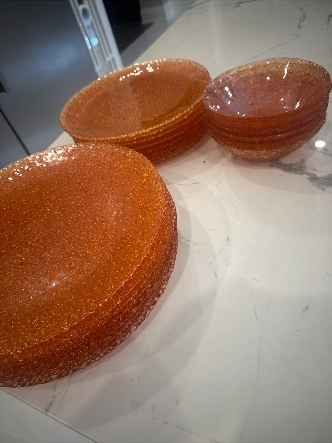 10Selling a set of textured amber-coloured glass bowls and plates. They're in great shape and would be a lovely addition to any table setting! 1. 8 extra large plates 2. 8 large plates 3. 6 bowls