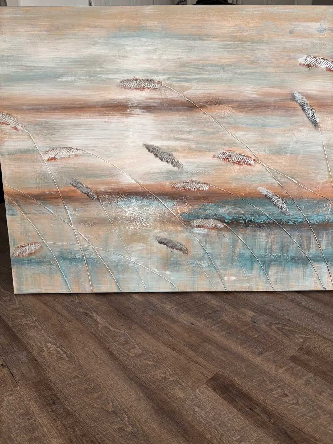 18A lovely piece of textured canvas wall art! The colours are soft and neutral, featuring blues, browns, and creams. It would look great in any room! 50inches x 40inches