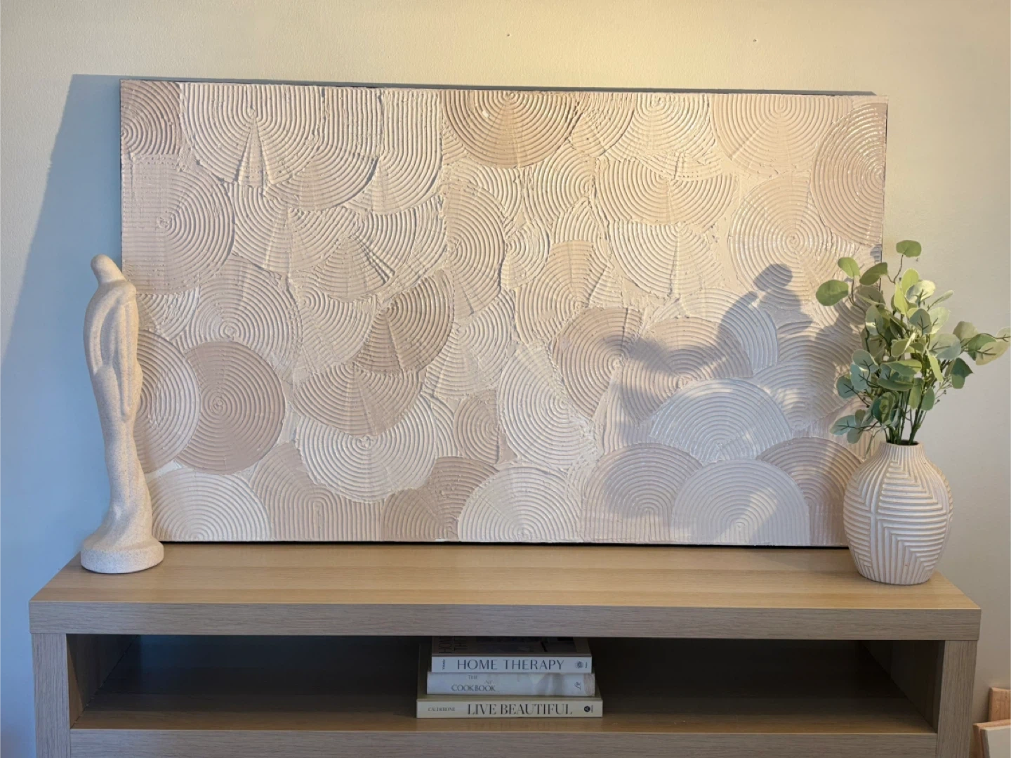 Selling a piece of textured wall art! It features a unique circular design and neutral colour palette. It's in great condition and would look lovely in any room of the house MEASUREMENTS: 30 inches by 50 inches Smoke free and pet free home
