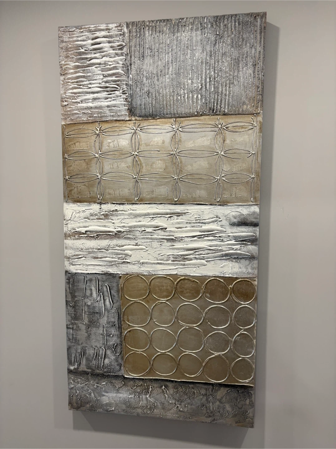 Unique textured wall art piece in neutral tones. Adds a touch of modern elegance to any room. The artwork features a mix of textures and patterns, creating a visually interesting focal point for your space
