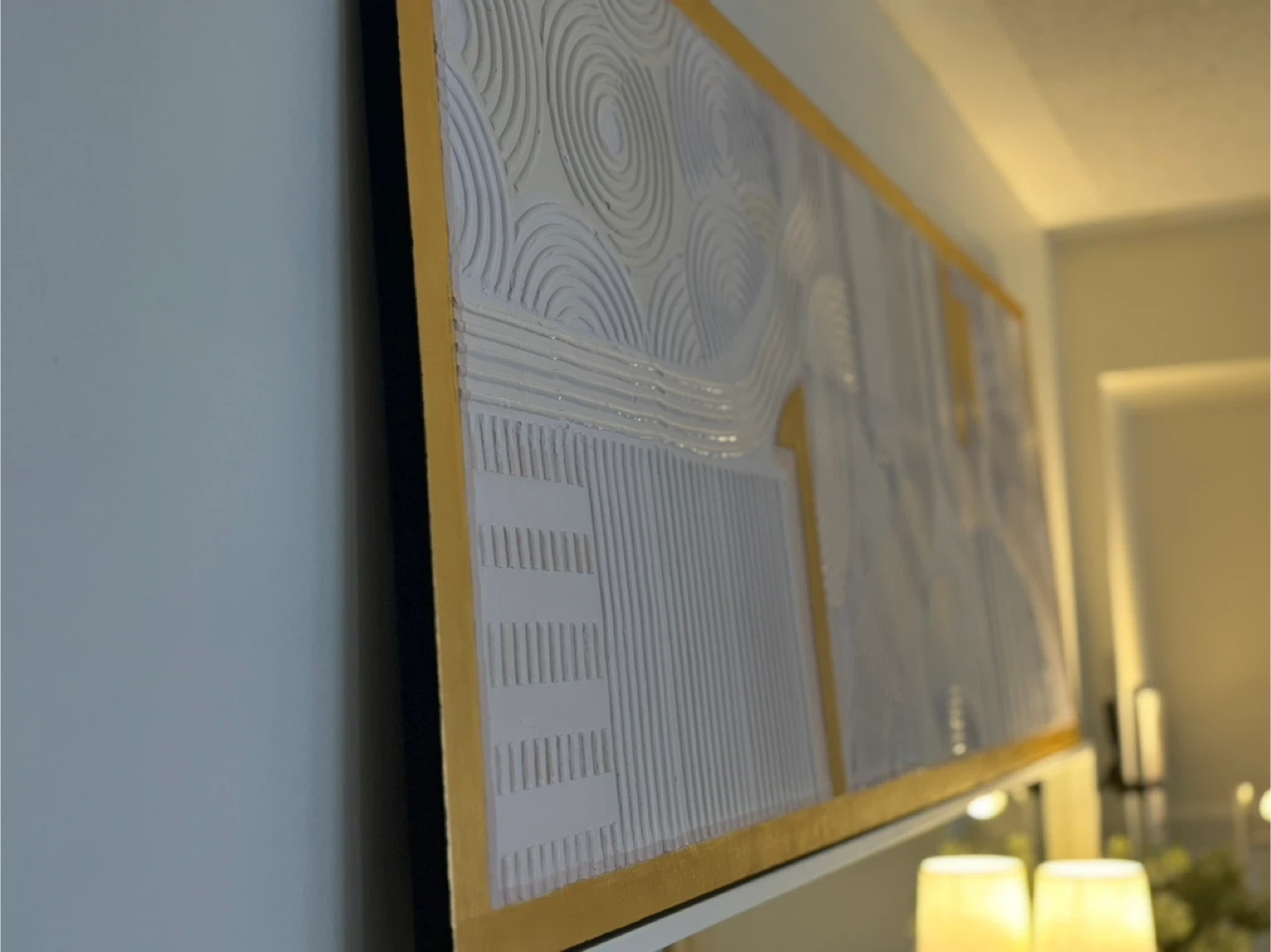 10Selling a unique piece of textured wall art! It features a modern design with a textured background and gold accents. It would look great in any room! Pickup is in downtown Brampton MEASUREMENTS: 22 inches by 55 inches