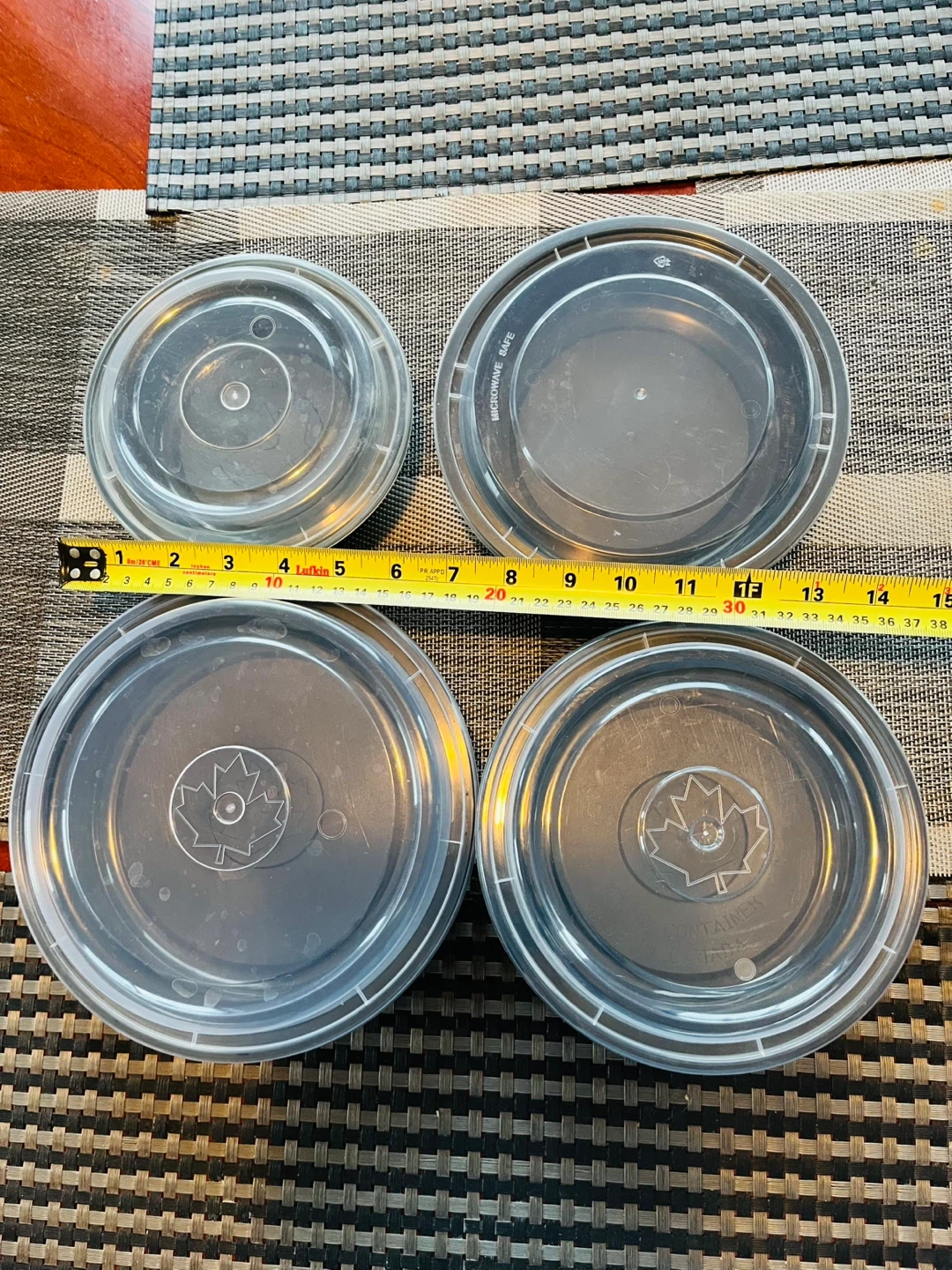 Different sizes (measurements in pictures). Microwave / dishwasher safe. Ideal for meal preps, catering, take-out / leftover meals, lunches, summer picnics, etc… AND perfect to store nick-nacks, art supplies, small toys (Lego). Great condition and excellent for organization! All containers have been sanitized in the dishwasher.