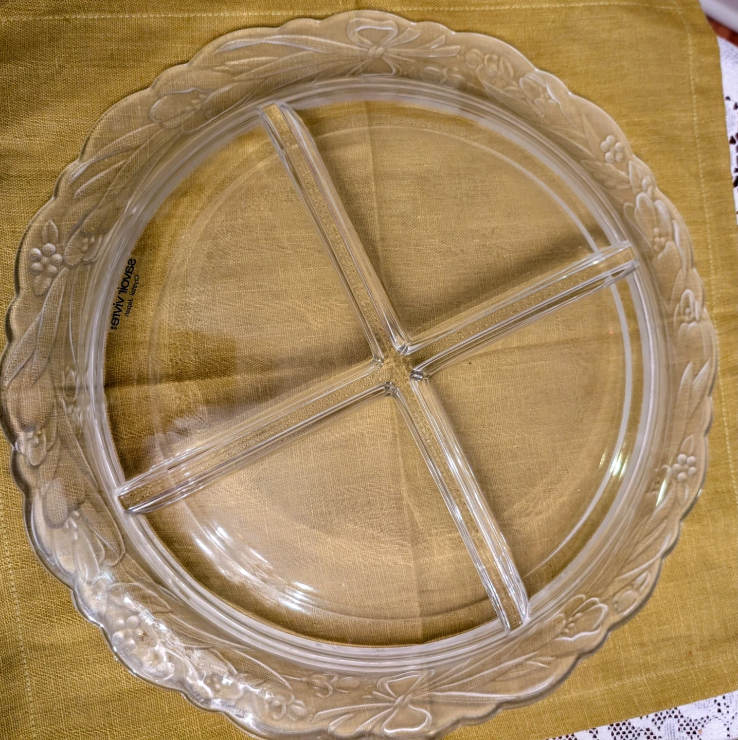 This clear glass serving platter features a decorative floral and ribbon embossed edge. It has four divided sections, perfect for serving appetizers or snacks. It's made of durable glass.