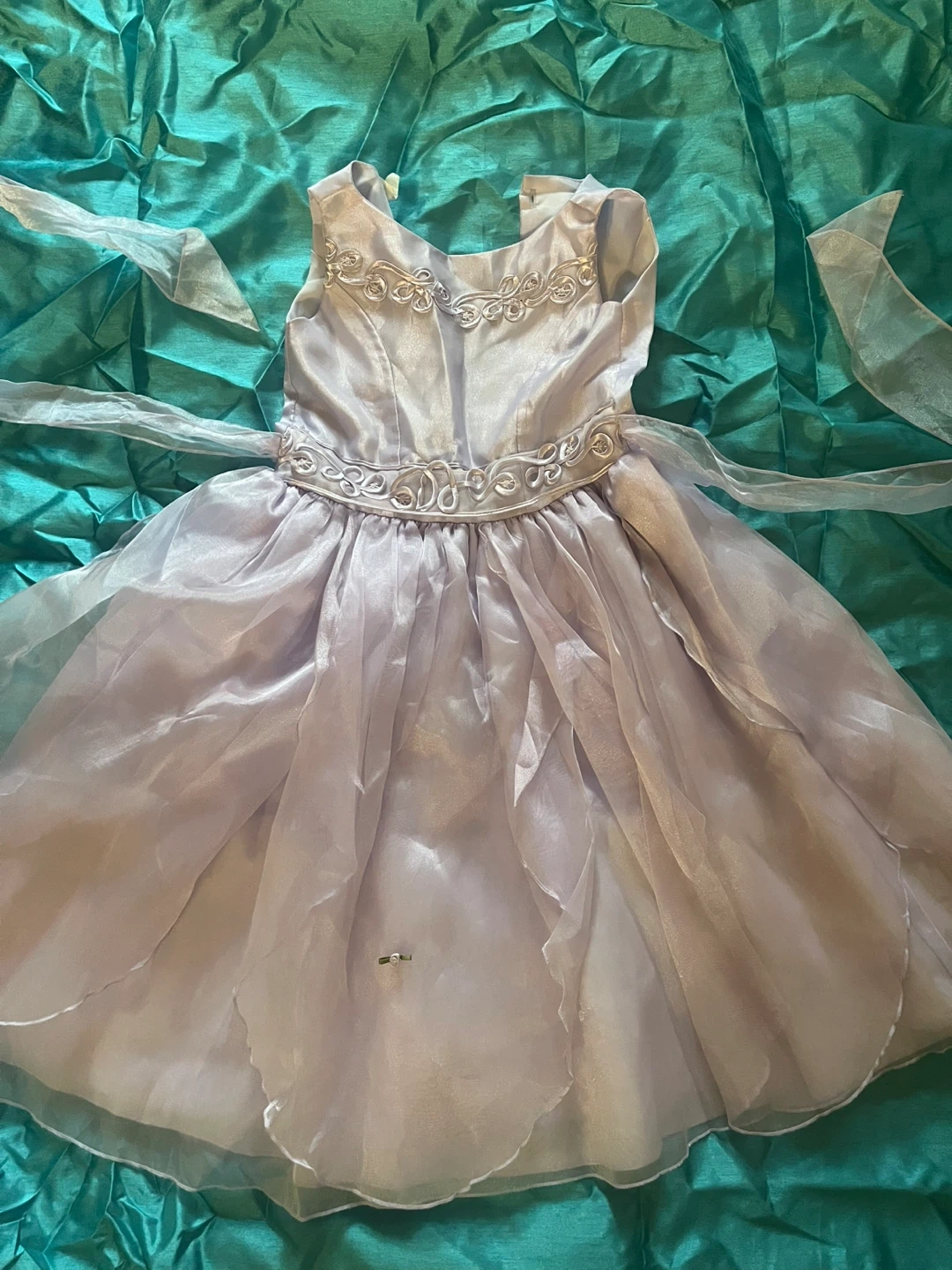 This is a beautiful light purple dress for a little girl. It's in great condition and perfect for a special occasion or just for fun. The dress is a size 2-8.