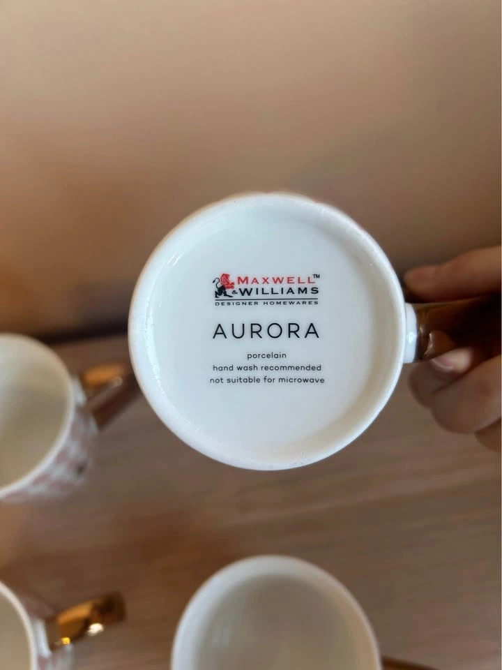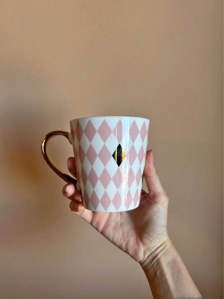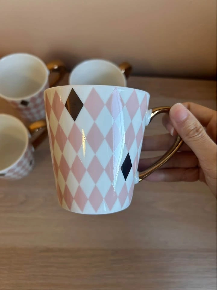 Four beautiful mugs which add a touch of class and elegance to your home. These are the Maxwell & Williams Aurora Diamond Mug with a gold handle and a pink harlequin/argyle pattern.