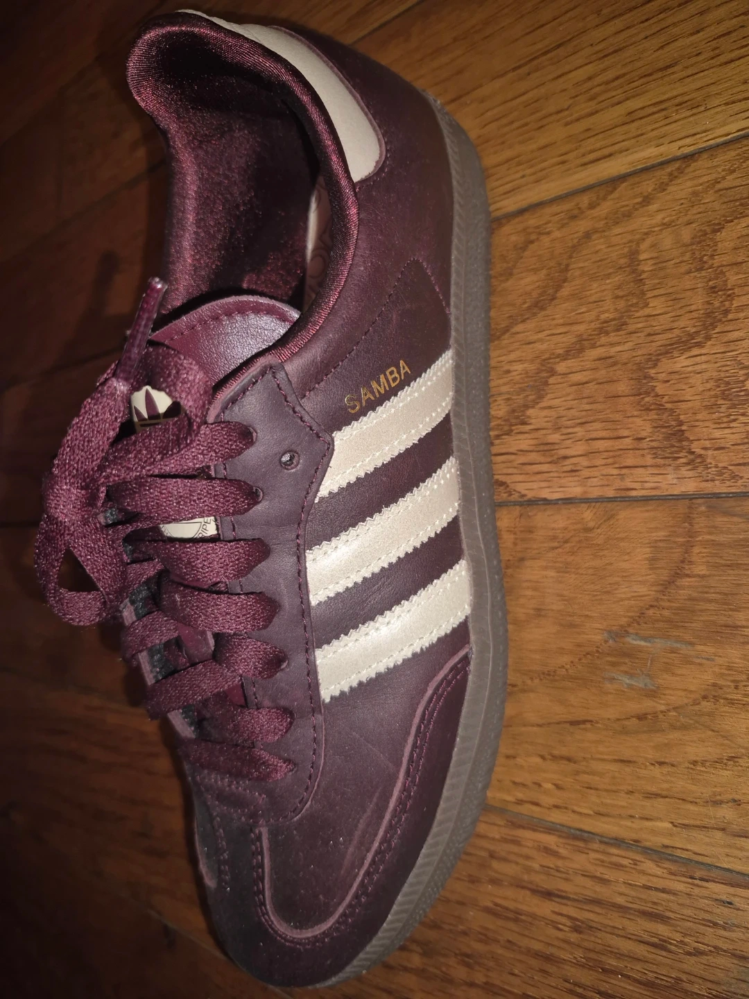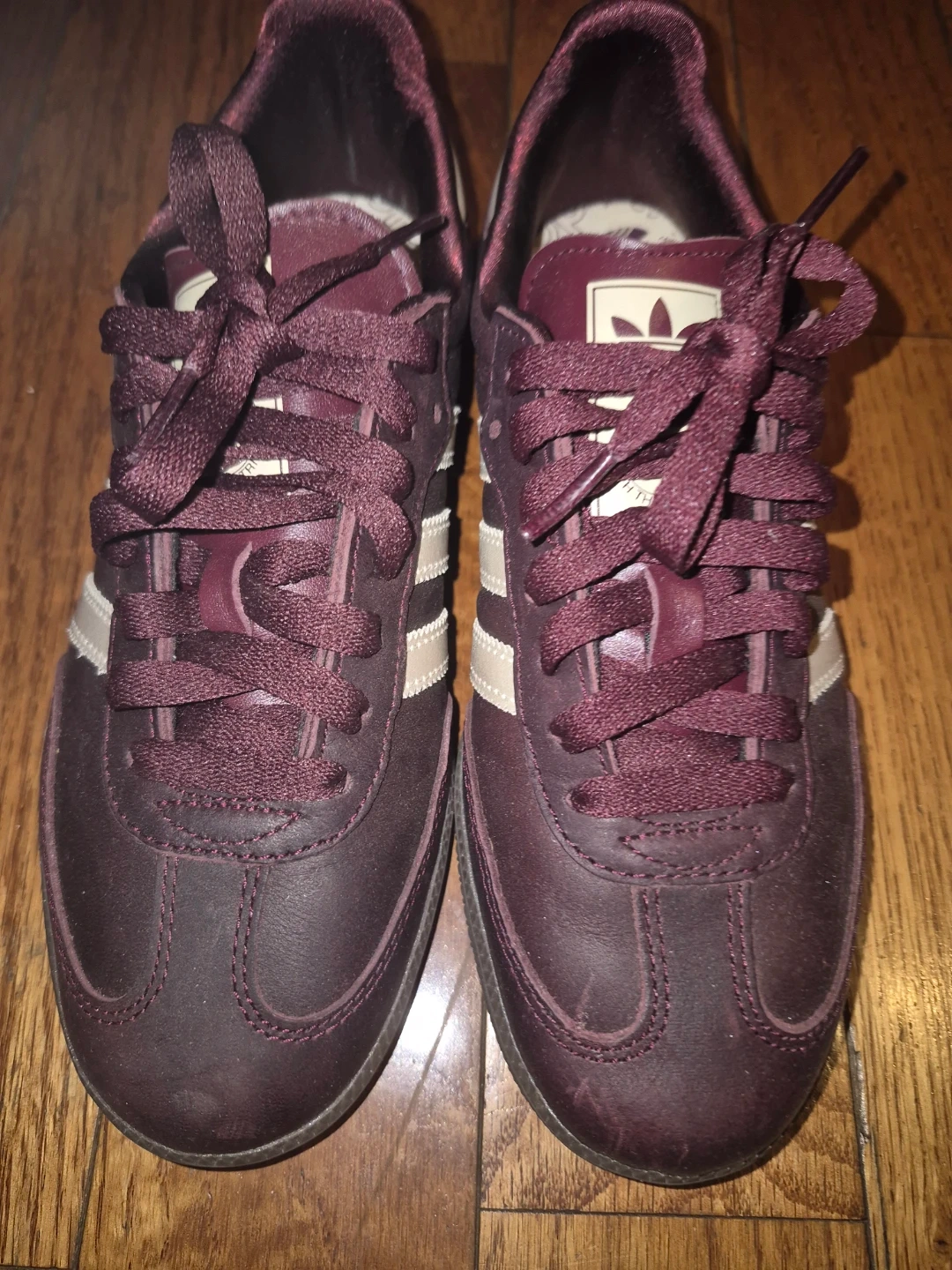 Classic Adidas Samba sneakers in a deep burgundy color with white stripes. These iconic shoes feature a durable construction and comfortable fit. Great for casual wear or athletic activities!