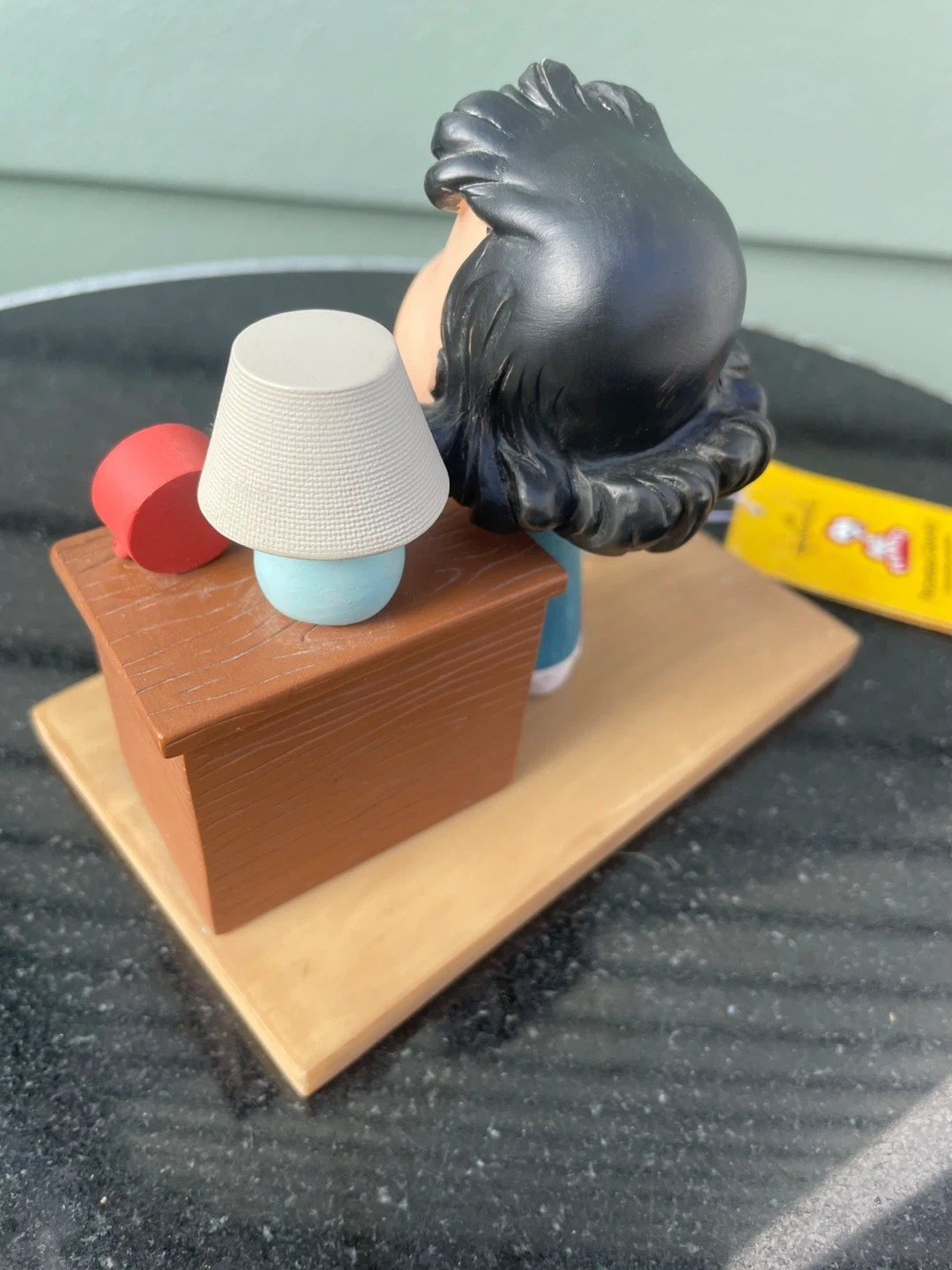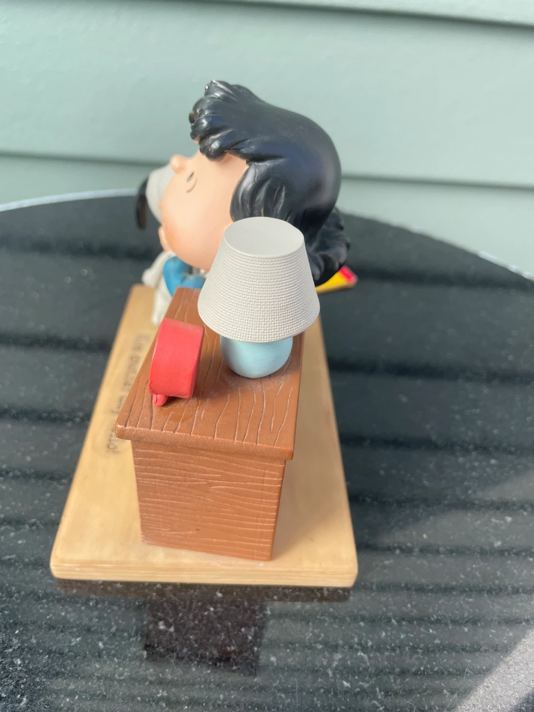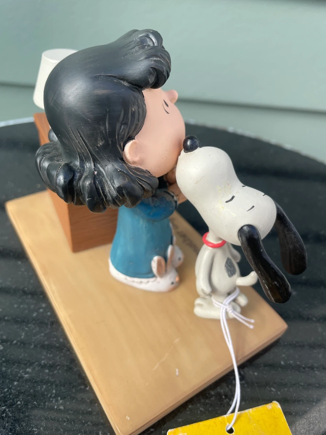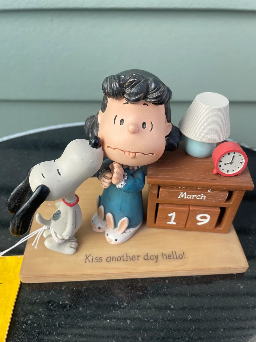 Cute Hallmark Peanuts perpetual calendar figurine featuring Lucy and Snoopy. The calendar is set to March 19 and has the phrase "Kiss another day hello!" inscribed. Made of resin, it's a great decorative piece for any Peanuts fan's desk or shelf.