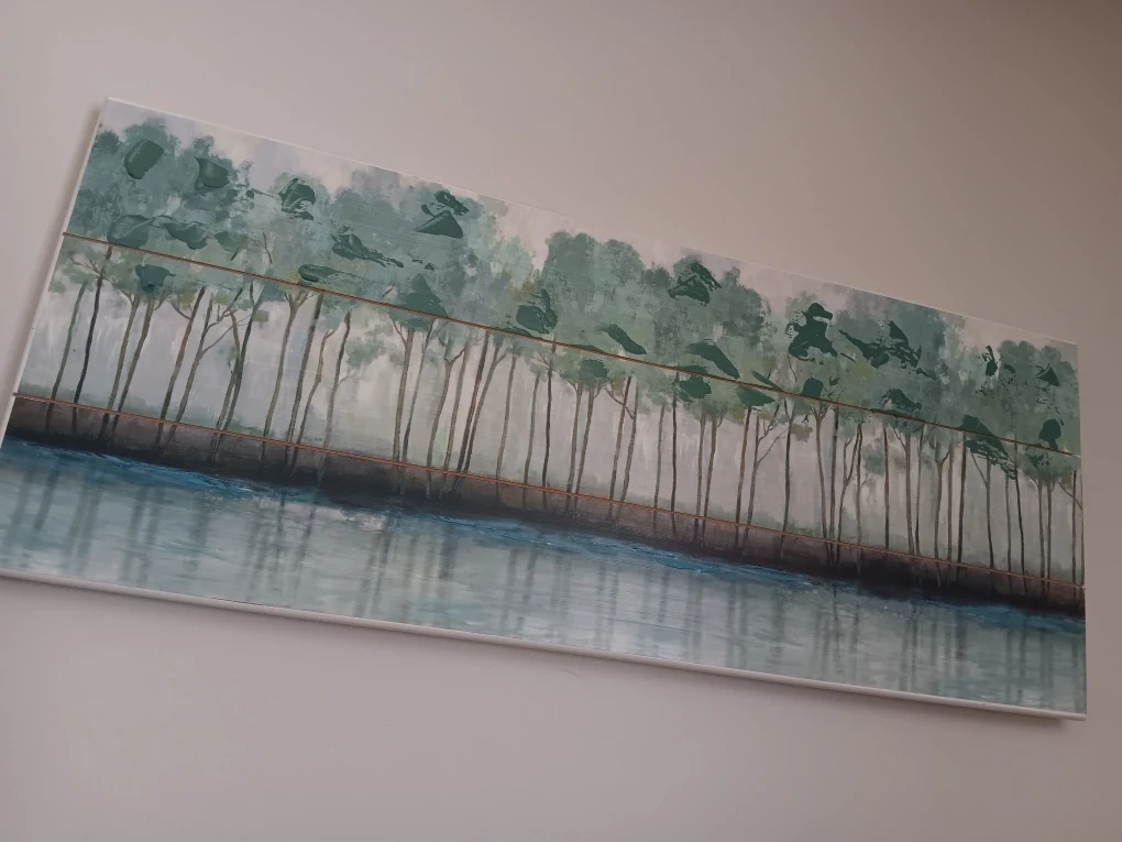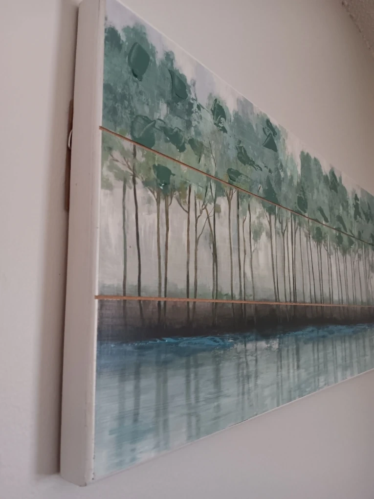 This long canvas wall art depicts a serene forest and lake scene. It's designed with a wood panel effect, adding a rustic touch. It's ready to hang and would brighten up any living space!