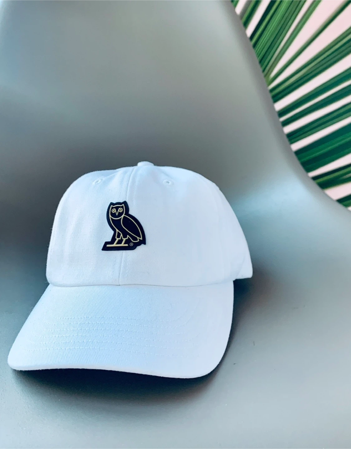 White baseball cap featuring the OVO owl logo. Adjustable strap with gold buckle closure. Cotton twill material.