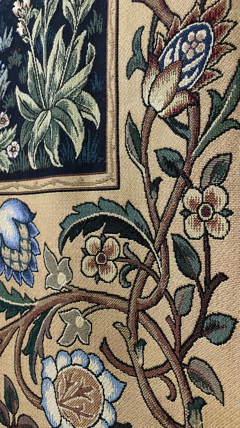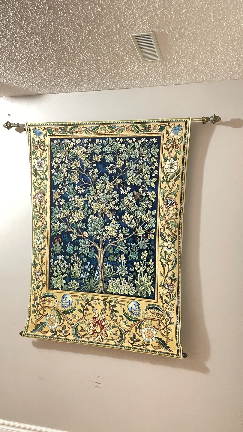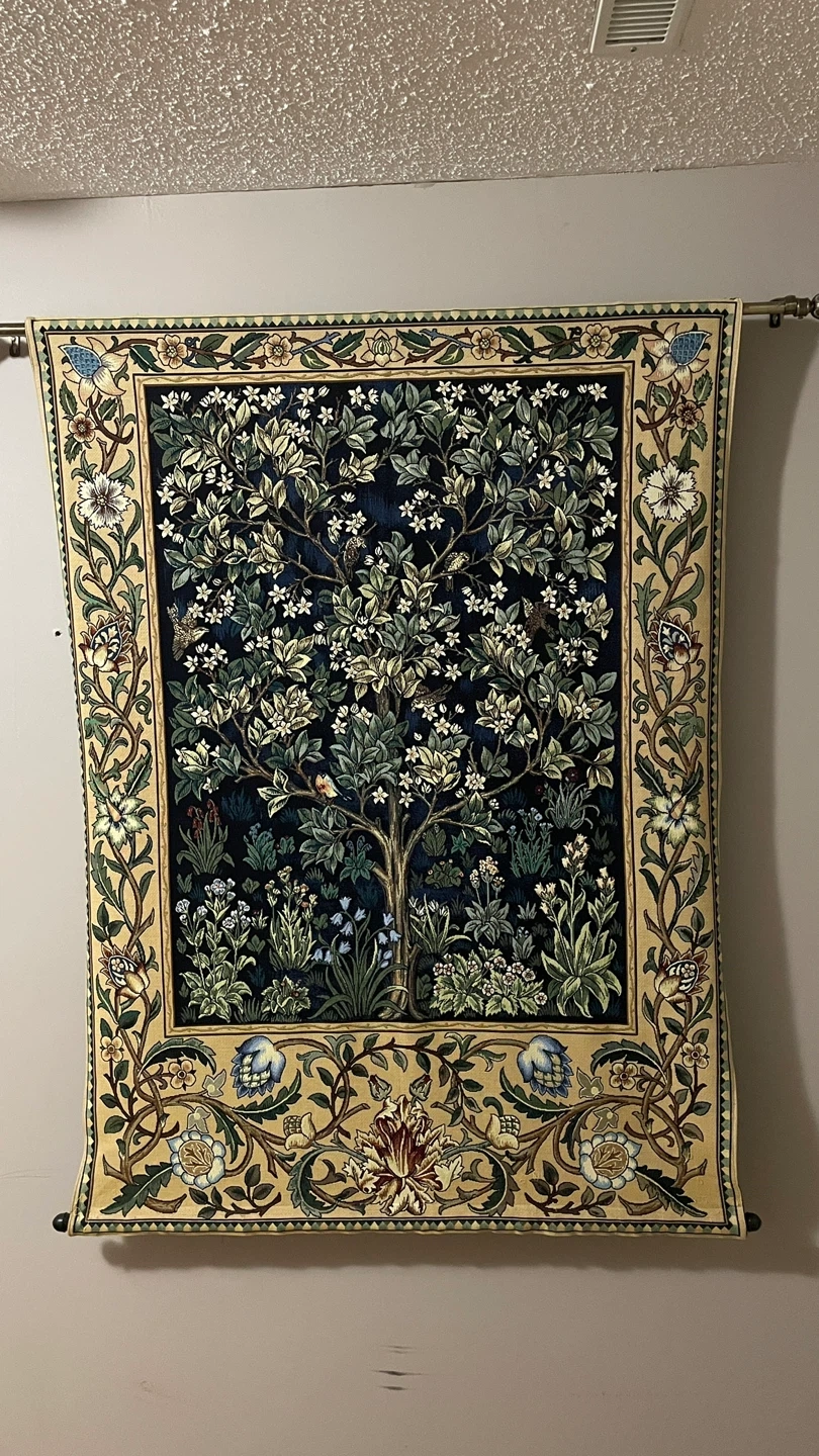 This is a beautiful woven tapestry featuring the iconic "Tree of Life" design by William Morris, originally purchased from Bombay Company several years ago.