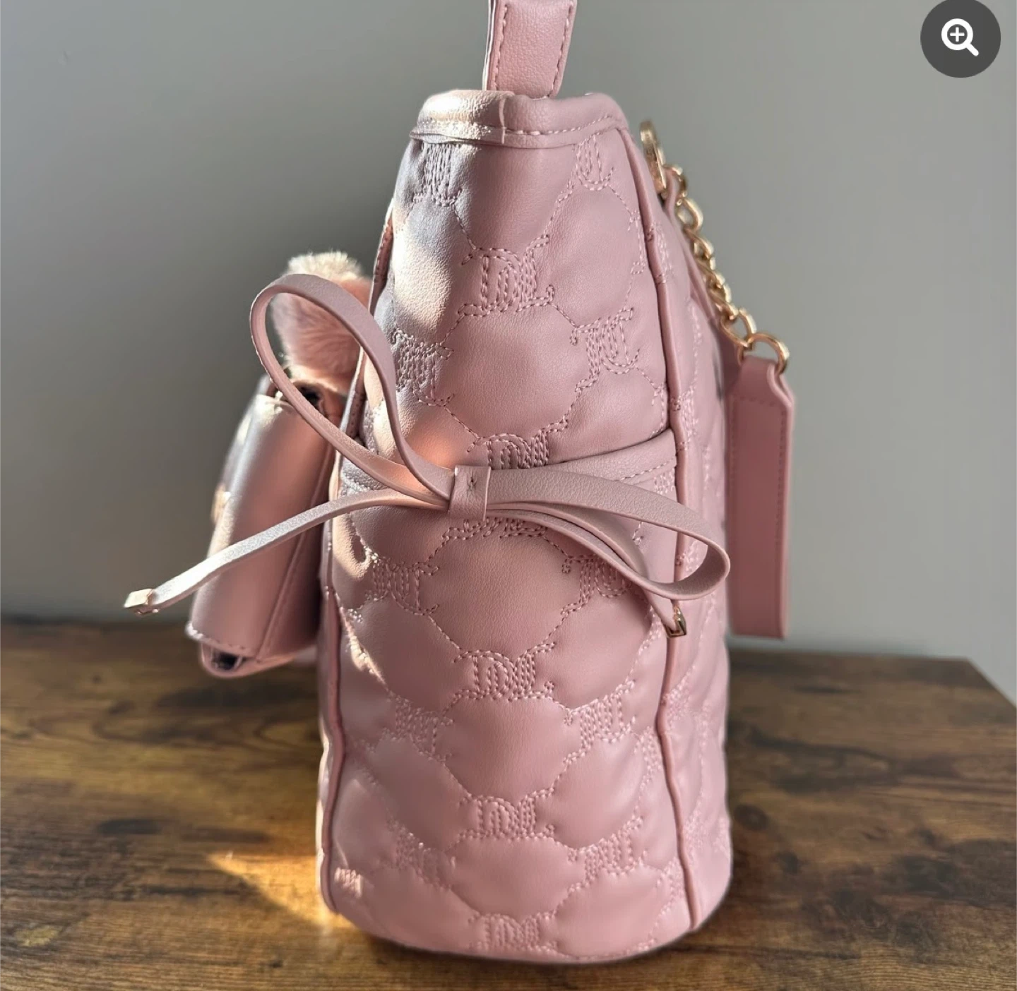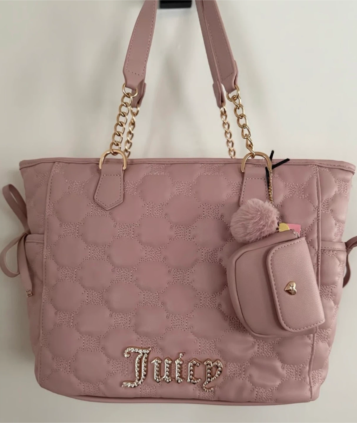 Check out this cute Juicy Couture tote bag! It features a quilted design and a lovely pink colour. It also has a small matching coin purse attached. Perfect for adding a touch of style to your everyday look!