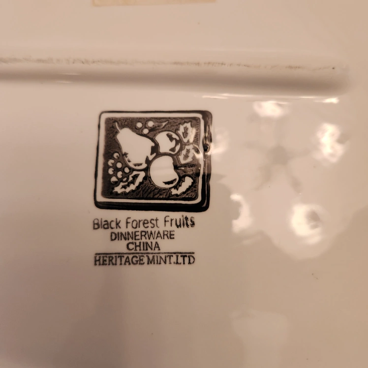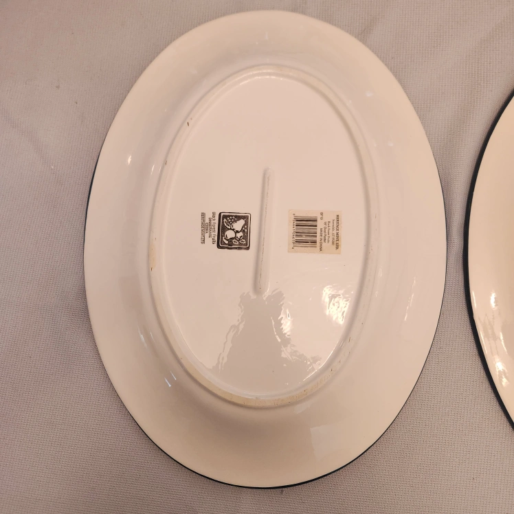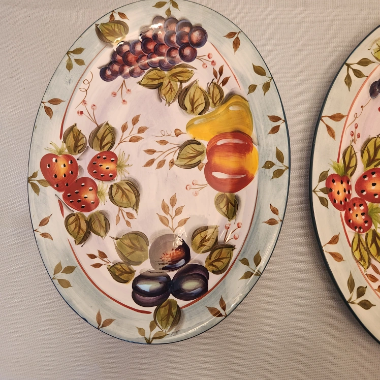 Beautiful set of two oval platters. Hand-painted fruit design. Dark blue rim. Excellent for serving. Part of the Black Forest Fuits collection by Heritage mint. no chips or damage.