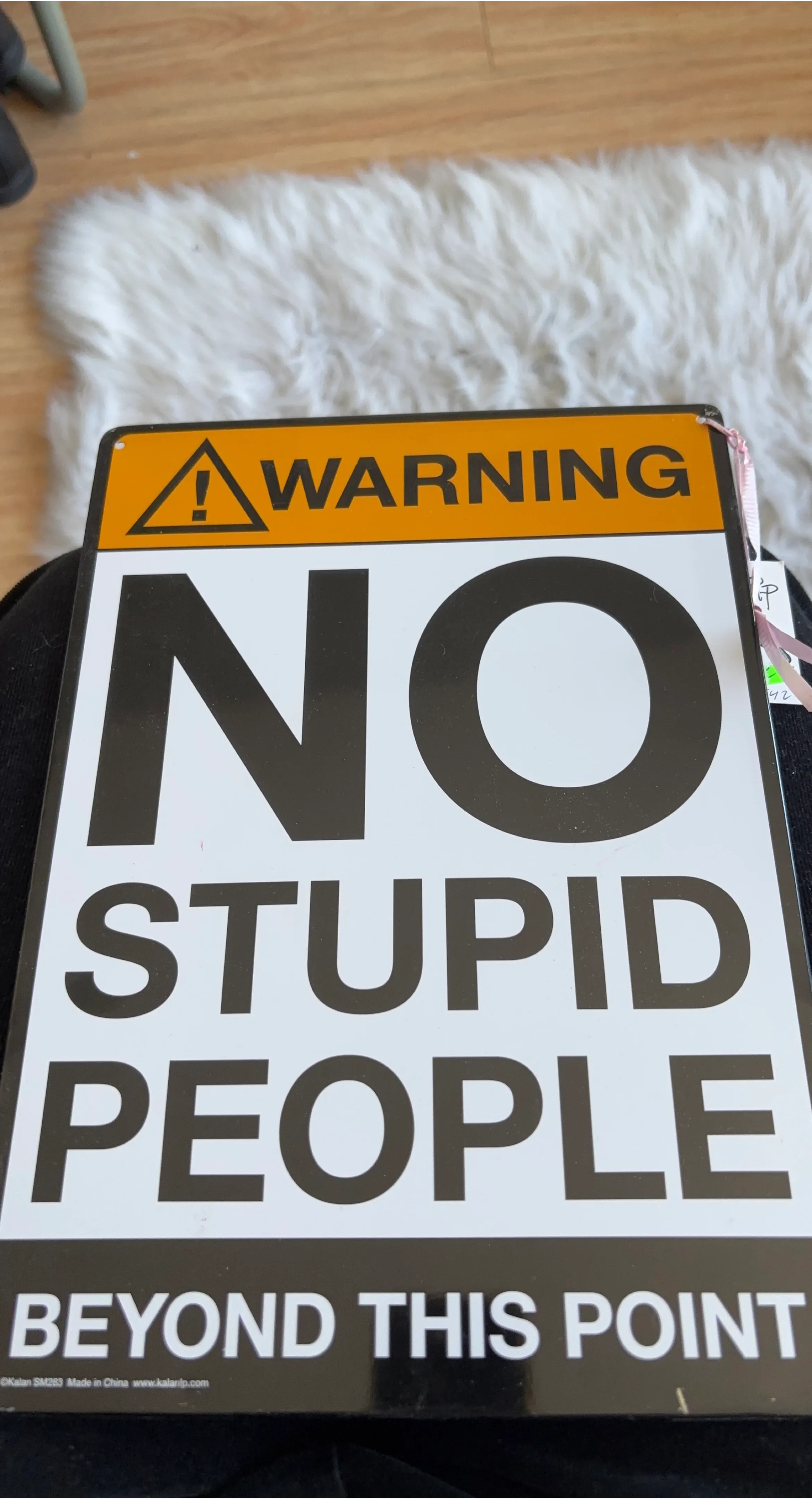 This is a metal warning sign that reads 'WARNING NO STUPID PEOPLE BEYOND THIS POINT'. It's great for a workshop or a home office! Measures approximately 12 inches by 8 inches.