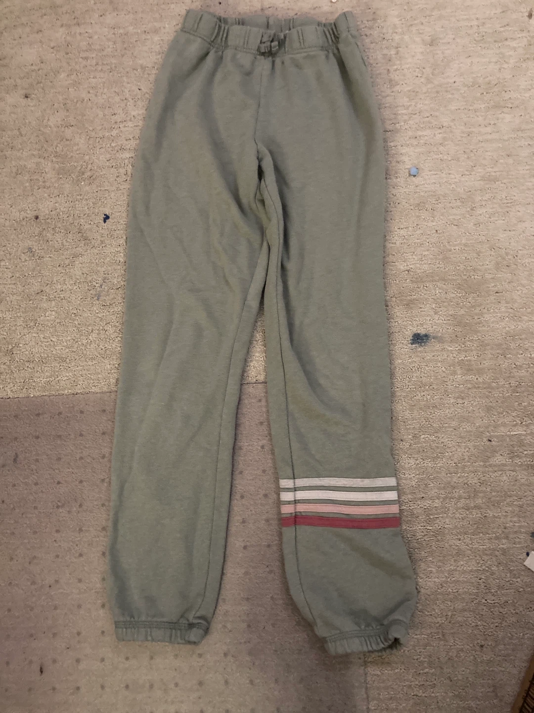 Comfy sage green joggers with an elastic waistband and drawstring. Features a decorative stripe detail at the ankle. Made from a soft, mid-weight fabric.