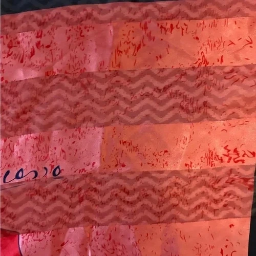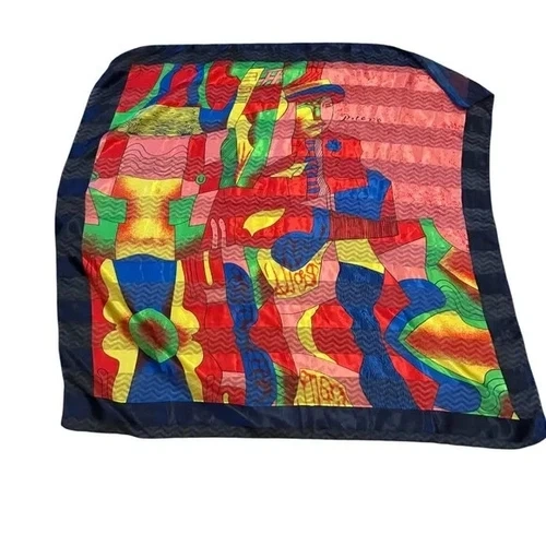Vibrant silk scarf with abstract design. Features red, blue, green, and yellow colors. Material is satin-like and a bit sheer. No tags. Size: 37x36".